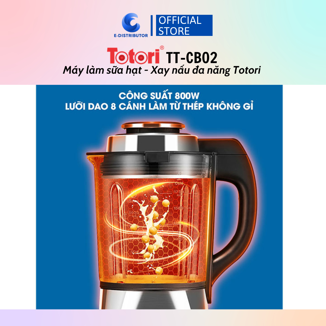 Máy làm sữa hạt - xay nấu đa năng Totori TT-CB02 - Hàng chính hãng   THÔNG SỐ KỸ THUẬT: - Thương hiệu: Totori - Sản xuất: Trung Quốc - Tên sản phẩm: Máy làm sữa hạt - xay nấu đa năng - Mã sản phẩm: TT-CB02 - Công suất: 800W - Dung tích: 1.75L - Phụ kiện đi kèm: Sách HDSD, Thực đơn nấu, cốc đong, giỏ hấp (inox), thanh khuấy nguyên liệu, vợt lọc bả, chổi cọ, mút xốp vệ sinh. - Bảo hành: 12 tháng   MÔ TẢ SẢN PHẨM: - Máy làm sữa hạt – Xay nấu đa năng TOTORI TT-CB02 thuộc dòng máy cao cấp, thiết kế tinh tế, sang trọng, chân đế vững chắc, giữ máy hoạt động ổn định trên mọi mặt phẳng. - Máy làm sữa hạt – Xay nấu đa năng TOTORI TT-CB02 vận hành với công suất 800W giúp chế biến món ăn, đồ uống tiết kiệm thời gian và tiết kiệm điện. - Lưỡi dao 8 cánh làm từ thép không gỉ cao cấp an toàn cho sức khỏe với tốc độ quay 28.000 vòng/phút đảm bảo thực phẩm được xay, nghiền nhuyễn mịn. Lưu ý: Để sữa nấu được mịn hơn, bạn nên sơ chế trước khi tiến hành nấu bằng cách tách vỏ hạt và có thời gian ngâm ủ cho hạt. - Bảng điều khiển – Chương trình cài đặt sẵn: Máy làm sữa hạt – Xay nấu đa năng TOTORI TT-CB02 được điều khiển bằng cảm ứng có màn hình hiển thị rõ ràng. Có tích hợp thêm nút tăng, giảm thời gian và tốc độ xay, giúp người dùng linh hoạt trong việc điều chỉnh thời gian và tốc độ xay thủ công phù hợp với từng loại nguyên liệu. - Máy làm sữa hạt – Xay nấu đa năng TOTORI TT-CB02 được trang bị 15 chương trình chuyên sâu cài đặt sẵn như sau : Sữa đậu nành – Cháo – Hầm và nấu – Đun trà – Súp – Hấp – Sữa ngô ( bắp ) – Cháo đặc – Sinh tố trái cây – Nước sốt – Sữa lắc – Sinh tố đá bào – Nấu nhanh sữa đậu nành – Nghiền – Tự động vệ sinh. - Chất liệu: cối thủy tinh 5 lớp có khả năng chịu lực, chịu nhiệt cao. Kể cả khi đun nấu ở nhiệt độ cao trong thời gian dài mà không lo sợ sản sinh các chất gây hại đến sức khỏe. - Chức năng chống trào thông minh: Máy được trang bị nắp chống trào với công nghệ chống tràn kép và phá bọt. Nắp cối có cảm biến chống tràn thông minh nhằm bảo đảm vệ sinh và an toàn trong quá trình chế biến. - Tiện ích an toàn: Máy chân đế chống trượt giúp máy cố định hạn chế rung lắc trong quá trình hoạt động. Chế độ khớp khóa an toàn, đảm báo máy không thể vận hành khi không lắp đúng các khớp. Tự ngắt khi quá tải, an toàn sử dụng. Hẹn giờ tối đa 12 tiếng.