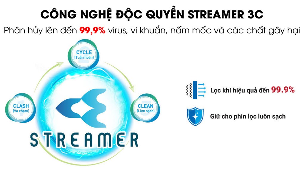 Khả năng lọc khí tối ưu nhờ công nghệ độc quyền bảo vệ kép Streamer và Ion Plasma - Phân hủy: Công nghệ độc quyền Streamer có khả năng phân hủy lên đến 99.9% virus, vi khuẩn, các loại nấm mốc, chất gây dị ứng bám trên phin lọc. Streamer đã được nhiều tổ chức kiểm nghiệm trên thế giới công nhận về khả năng loại bỏ các chủng virus cúm mùa, vi khuẩn, nấm mốc, các chất gây dị ứng.