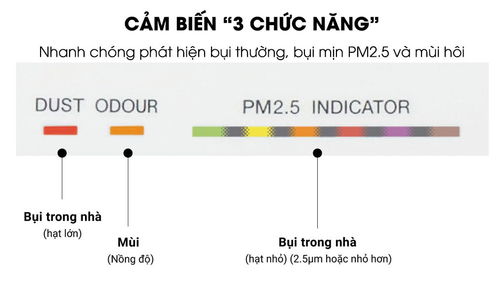 - Không bị trộn lẫn khí bẩn vào luồng khí sạch: Thiết kế của miệng hút gió bẩn cách xa và tách biệt với miệng trả gió, giúp giảm tối thiểu lượng khí bẩn bị trộn lẫn với luồng không khí sạch thổi ra khỏi máy. Hệ thống hút gió mạnh mẽ từ 3 hướng, giúp nhanh chóng hút sạch bụi bẩn vào hệ thống lọc thải, trả lại bầu không khí trong lành cho căn phòng bạn Máy lọc không khí với thiết kế 3 miệng hút gió (phía trước - bên trái - bên phải), cho phép hút vào một lượng lớn không khí, từ đó nhanh chóng làm sạch không khí trong phòng, gia tăng hiệu suất lọc khí. Nhờ vào thiết kế 3 hướng hút, bạn có thể đặt máy sát tường mà vẫn đảm bảo hiệu suất lọc khí đạt mức tối ưu được trang bị cảm biến "3 chức năng" thông minh, nhanh chóng phát hiện bụi mịn PM2.5, bụi thường và mùi hôi Máy lọc không khí được trang bị cảm biến độ nhạy cao, phát hiện nhanh chóng bụi thô và bụi mịn PM2.5, giúp người dùng theo dõi được mức độ ô nhiễm không khí, từ đó tìm ra phương pháp xử lý phù hợp cho không gian sống của mình. Loại bỏ ô nhiễm không khí qua 3 bước lọc mạnh mẽ