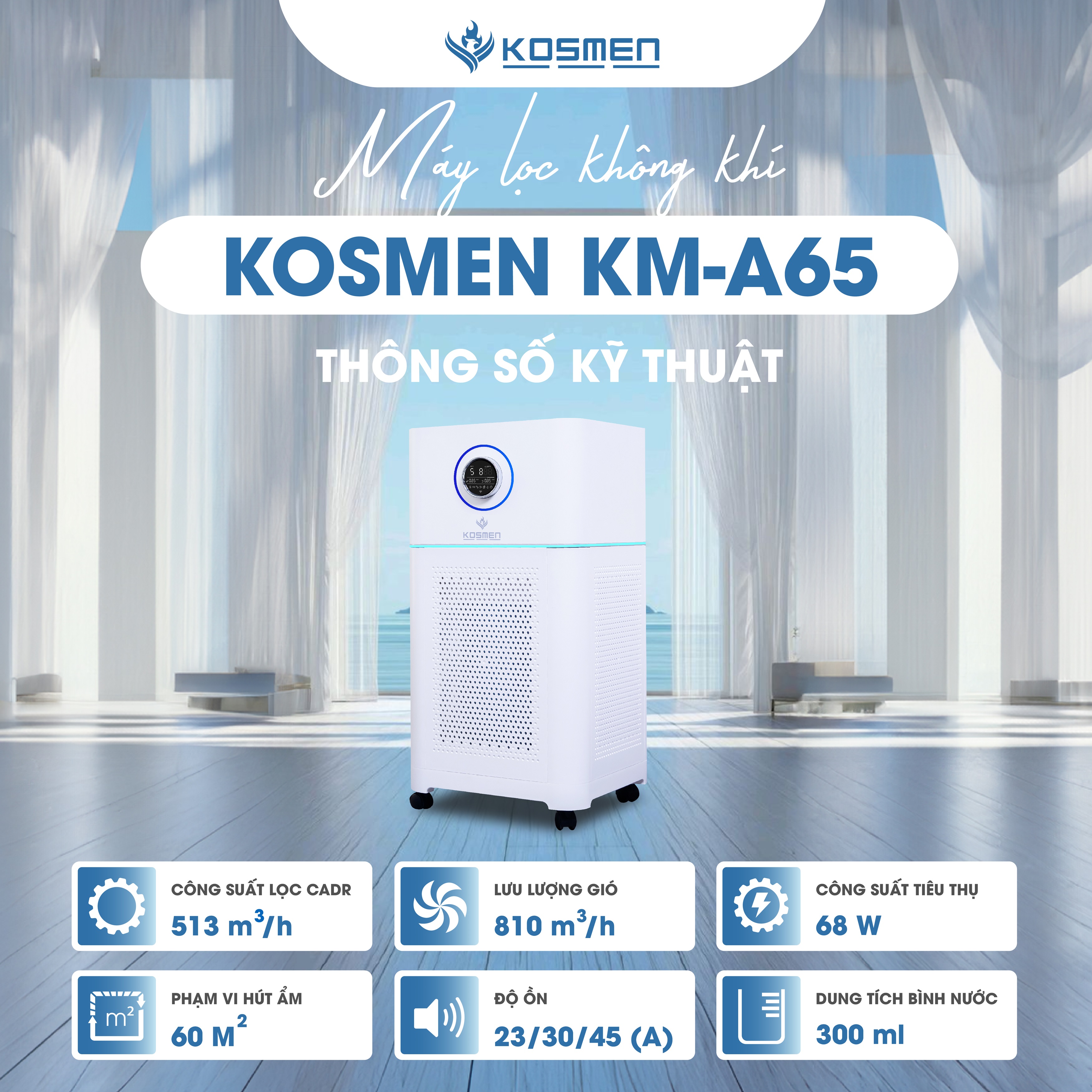 Kosmen KM-A65 sở hữu 3 lớp lọc bụi gồm màng lọc thô, màng lọc HEPA H13 và màng lọc than hoạt tính giúp loại bỏ bụi bẩn hiệu quả.