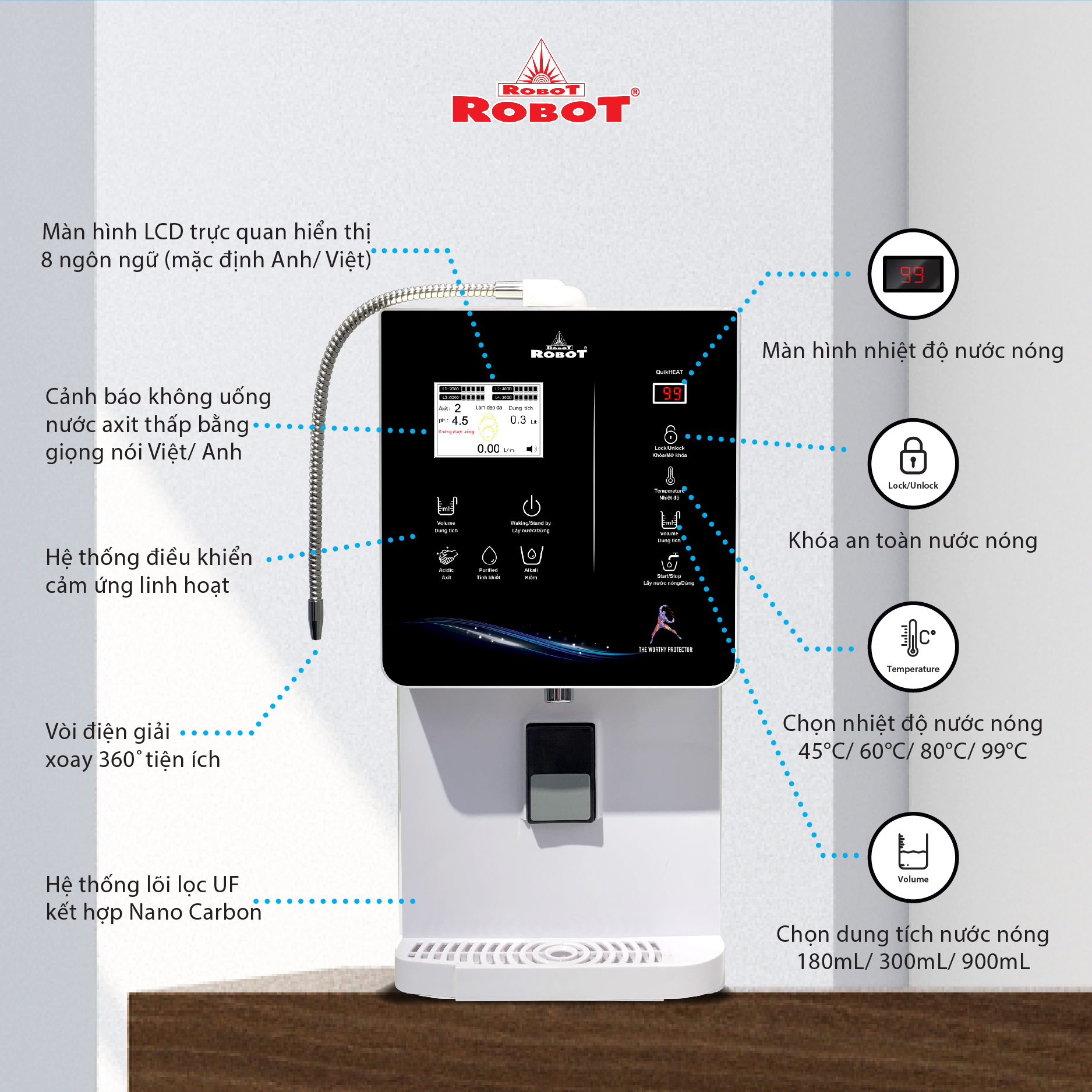 - Máy lọc nước điện giải iON kiềm Nóng Lạnh ROBOT ionQueen 1113, tạo 13 loại nước bổ ích, pH 3.5 --> 11.0 - Đáp ứng mọi nhu cầu trong cuộc sống ● Tăng cường sức đề kháng, hỗ trợ phòng ngừa và hồi phục đối với bệnh mãn tính ● Cải thiện hệ tiêu hóa, giảm các triệu chứng của bệnh về dạ dày ● Bù khoáng và chất điện giải cho người chơi thể thao, vận động mạnh ● Trung hòa axit trong cơ thể, đào thải độc tố, giải rượu bia ● Sơ chế thực phẩm, làm sạch rau, củ, quả… ● Nước làm đẹp, pH 5.5 tương tự như toner giúp làm mịn da, ngăn ngừa lão hóa ● Dùng gội đầu giúp tóc bóng mượt, chắc khỏe ● Khử khuẩn, vệ sinh thực phẩm, đồ vật và các bề mặt Kiểu dáng hiện đại - Thiết kế chinh phục mọi không gian ● Kiểu dáng để bàn, khác biệt so với các dòng điện giải khác ● Sử dụng linh hoạt cho mọi không gian ● Vòi nước điện giải xoay 360° ● Hệ thống điều khiển cảm ứng trên mặt phủ kính với màn hình LCD tinh tế