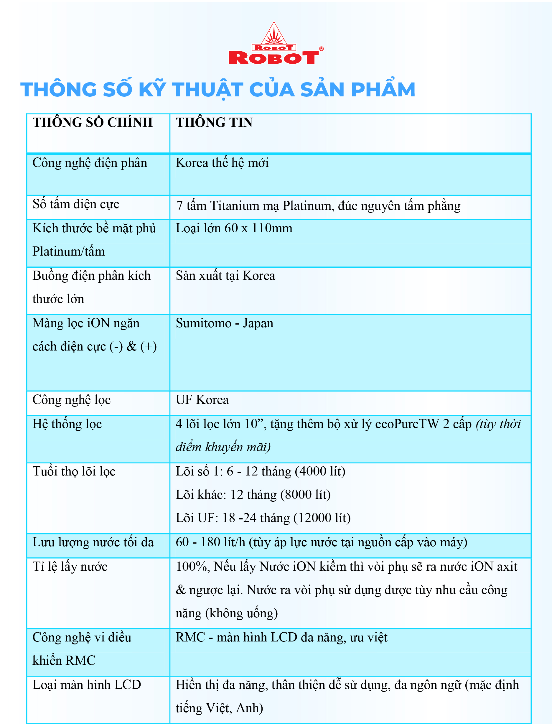 - Và 3 mức nước iON axit (pH 4.5/5.0/5.5). Chất lượng nước đạt chỉ số tối ưu, nồng độ Hydro hoạt tính lên đến ~ 800 -> 950 ppb, chống oxy hóa (ORP) lên đến ~ -400 -> -600 mV, đáp ứng mọi nhu cầu sử dụng trong cuộc sống. Máy lọc nước điện giải iON kiềm Nóng Lạnh ROBOT ionQueen là dòng Để Bàn đầu tiên trên thế giới, được thiết kế kiểu dáng hiện đại, thiết kế chinh phục mọi không gian. Đặc biệt, được tích hợp thêm chức năng Nóng Thông Minh – Lạnh độc đáo & duy nhất trên thị trường, mang lại nhiều tiện ích cho người dùng. Chỉ số Hydrogen, ORP của nước tùy thuộc số tấm điện cực, đặc tính nguồn nước & “điều kiện đo trong phòng thí nghiệm chuyên nghiệp, đạt chuẩn”. Máy lọc nước điện giải iON kiềm Nóng Lạnh ROBOT ionQueen 711, tạo 11 loại nước bổ ích, pH 4.5 ---> 10.5 - Đáp ứng mọi nhu cầu trong cuộc sống Có thể tham khảo ý kiến của Bác sĩ hoặc chuyên gia dinh dưỡng để được hướng dẫn loại nước uống phù hợp nhất cho cơ thể. Kiểu dáng hiện đại - Thiết kế chinh phục mọi không gian ● Kiểu dáng để bàn, khác biệt so với các dòng điện giải khác ● Sử dụng linh hoạt cho mọi không gian ● Vòi nước điện giải xoay 360° ● Hệ thống điều khiển cảm ứng trên mặt phủ kính với màn hình LCD tinh tế Với mong muốn nhiều gia đình Việt có thể sử dụng nước điện giải iON kiềm với chi phí hợp lý để bảo vệ sức khỏe, sắc đẹp & nâng cao chất lượng cuộc sống, ROBOT mang đến sản phẩm “Chất lượng Quốc tế - Giá thành Việt Nam”, phù hợp với mức sống của nhiều người. Tiết kiệm cho người tiêu dùng đến hơn một nửa chí phí so với máy nhập khẩu chỉ từ 30 – 50%, nhưng sở hữu nhiều ưu điểm, tính năng vượt trội, chất lượng cao. Chế độ bảo hành chính hãng, tận nơi, vật tư và linh kiện, lõi lọc luôn có sẵn hạn chế tối đa chi phí sửa chữa, bảo trì. VĐV Cầu Lông Nguyễn Tiến Minh – tay vợt từng đứng Top 5 Thế Giới chia sẻ: Sau một thời gian sử dụng Máy lọc nước điện giải iON kiềm Minh thấy cải thiện sức khỏe rất nhiều và tốc độ hồi phục sau tập luyện, thi đấu cũng nhanh hơn so với trước đây. Bây giờ mỗi khi đi tập, hay khi đi thi đấu, Minh đều mang theo nước iON kiềm để uống. ROBOT là một thương hiệu Việt Nam uy tín nên Minh hoàn toàn tin tưởng và lựa chọn Máy lọc nước điện giải iON kiềm ROBOT. ️Thông Tin Thương Hiệu CÔNG TY CỔ PHẦN ĐẦU TƯ ROBOT