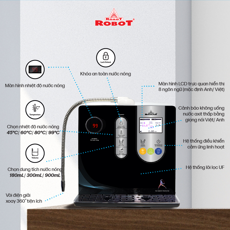 Với mong muốn nhiều gia đình Việt có thể sử dụng nước điện giải iON kiềm với chi phí hợp lý để bảo vệ sức khỏe, sắc đẹp & nâng cao chất lượng cuộc sống, ROBOT mang đến sản phẩm “Chất lượng Quốc tế - Giá thành Việt Nam”, phù hợp với mức sống của nhiều người. Tiết kiệm cho người tiêu dùng đến hơn một nửa chí phí so với máy nhập khẩu chỉ từ 30 – 50%, nhưng sở hữu nhiều ưu điểm, tính năng vượt trội, chất lượng cao.
