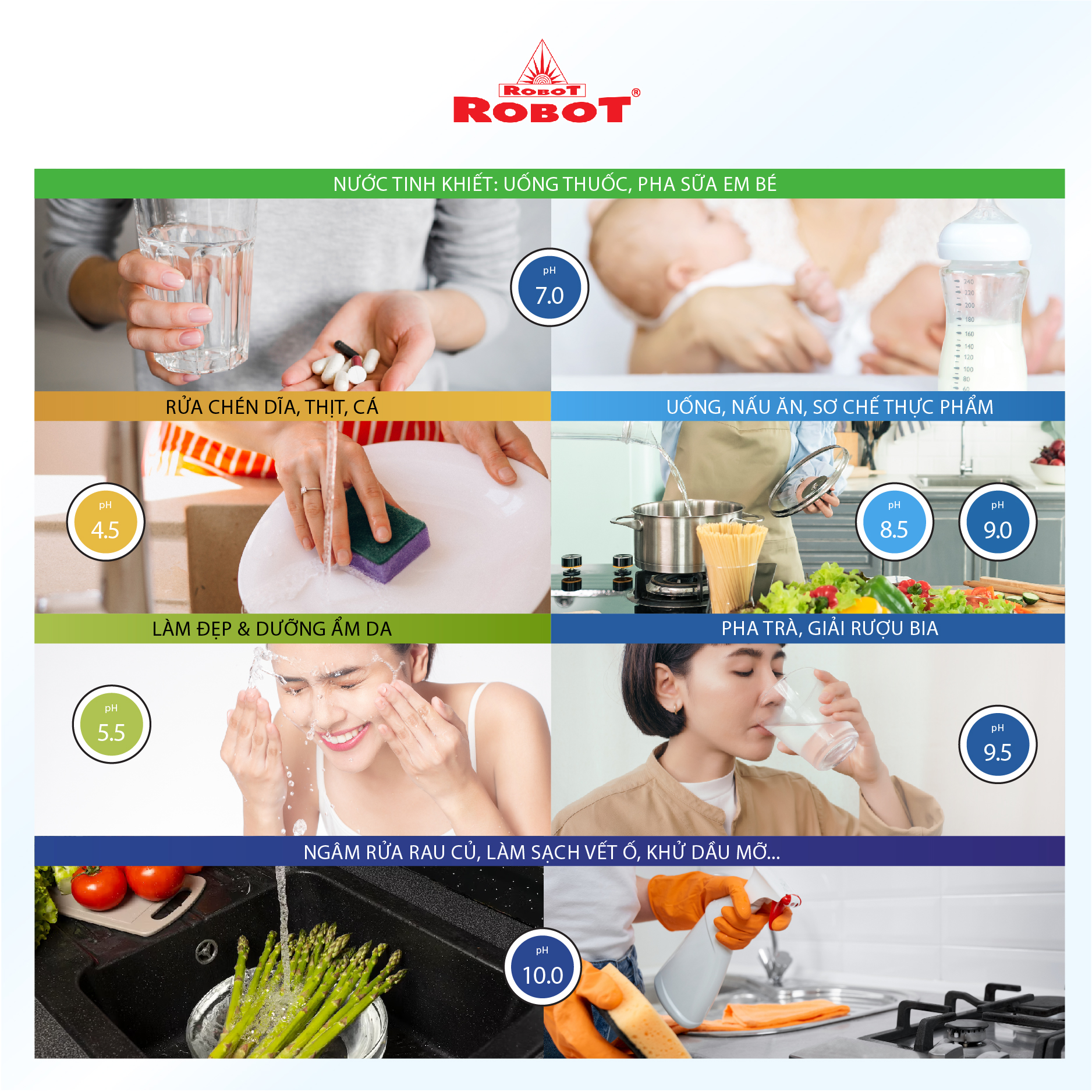 - Và 2 mức nước iON axit (pH 4.5/5.5). Chất lượng nước đạt chỉ số tối ưu, nồng độ Hydro hoạt tính lên đến ~ 350 -> 600 ppb, chống oxy hóa (ORP) lên đến ~ -300 -> -450 mV, đáp ứng mọi nhu cầu sử dụng trong cuộc sống. Máy lọc nước điện giải iON kiềm Nóng ROBOT ionSmart được thiết kế kiểu dáng hiện đại, thiết kế chinh phục mọi không gian. Đặc biệt, bộ sưu tập 5 sắc màu pastel hiện đại đáp ứng mọi sở thích và phong cách nội thất, chắc chắn sản phẩm sẽ là điểm nhấn đặc sắc trong ngôi nhà của bạn. Chỉ số Hydrogen, ORP của nước tùy thuộc số tấm điện cực, đặc tính nguồn nước & “điều kiện đo trong phòng thí nghiệm chuyên nghiệp, đạt chuẩn”. ️ Máy lọc nước điện giải iON kiềm Nóng ROBOT ionSmart 38, tạo 8 loại nước bổ ích, pH từ 4.5 --> 10.5 - Đáp ứng mọi nhu cầu trong cuộc sống Có thể tham khảo ý kiến của Bác sĩ hoặc chuyên gia dinh dưỡng để được hướng dẫn loại nước uống phù hợp nhất cho cơ thể. Kiểu dáng hiện đại - Thiết kế chinh phục mọi không gian