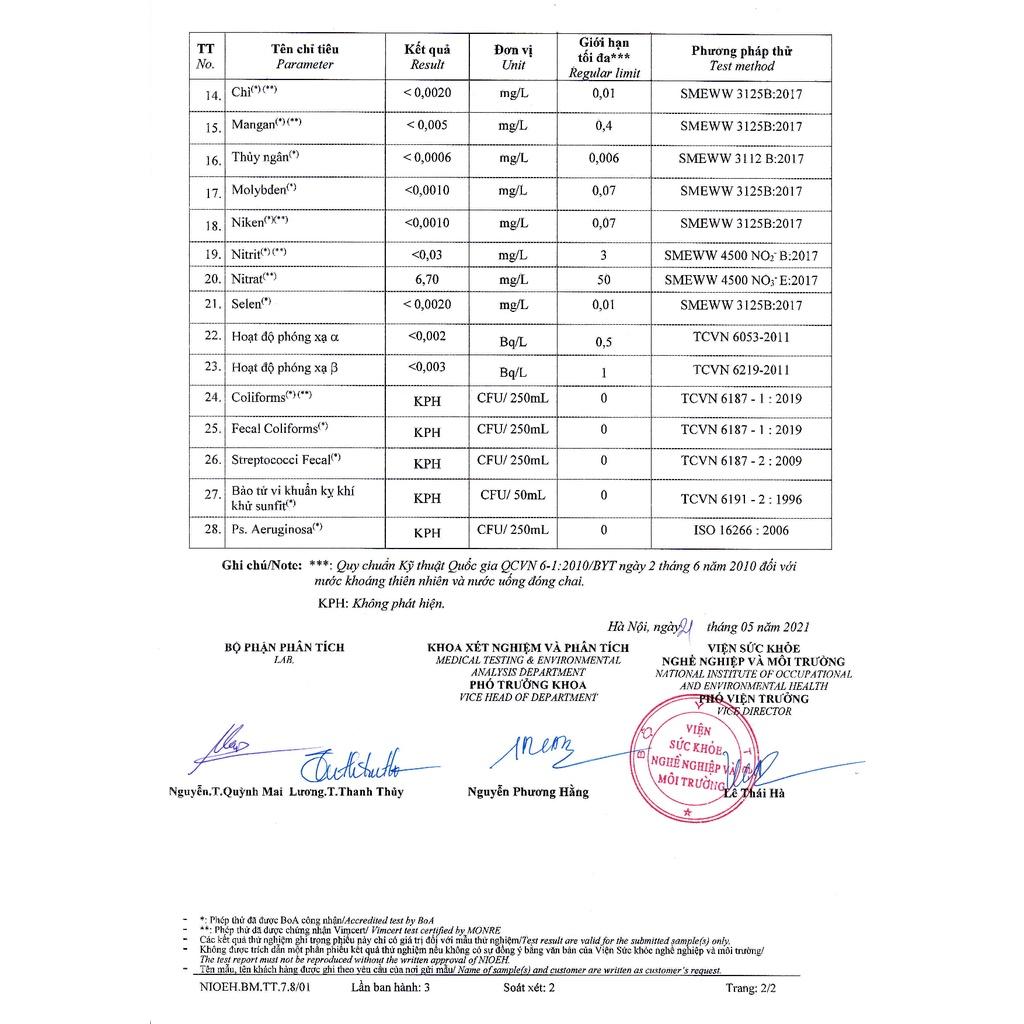 Nguồn nước sau lọc đạt Quy chuẩn cấp Quốc gia về nước uống trực tiếp QCVN 6-1:2010/BYT được chứng nhận bởi Viện SKNN&MT Bộ Y Tế. Một trong những phòng xét nghiệm uy tín hàng đầu trong nước và quốc tế. Chất lượng nguồn nước đảm bảo an toàn tuyệt đối với sức khỏe người tiêu dùng khi uống trực tiếp