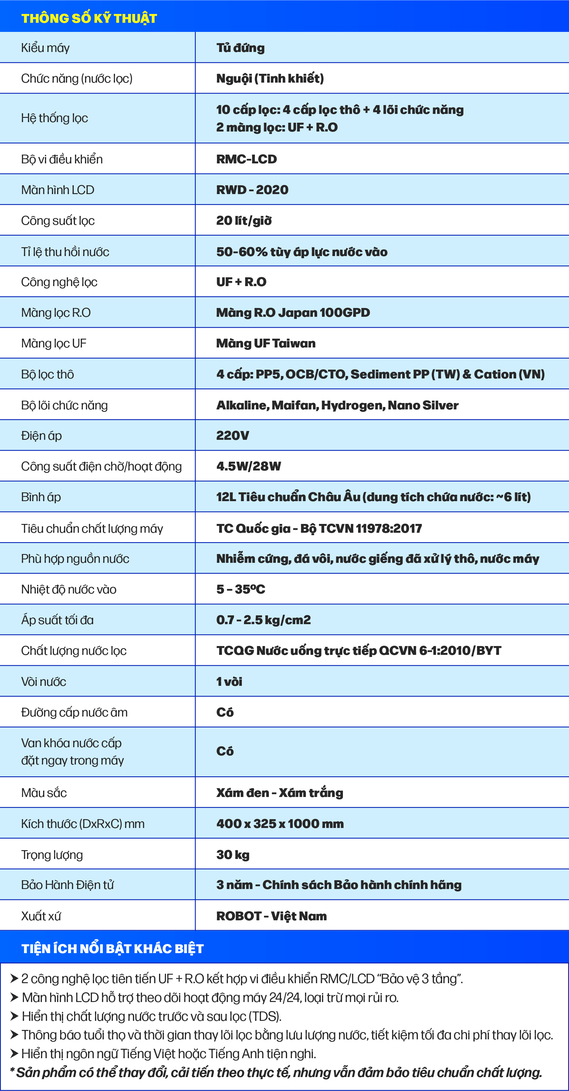 - Đặc biệt, sản phẩm cũng vinh dự liên tục xác lập Kỷ Lục Việt Nam & Kỷ Lục Châu Á “Máy lọc nước đầu tiên tích hợp 2 màng lọc UF & R.O kết hợp với công nghệ điều khiển RMC – màn hình LCD cảnh báo an toàn, hỗ trợ đa ngôn ngữ”, như một lời cam kết chất lượng dành cho người dùng.