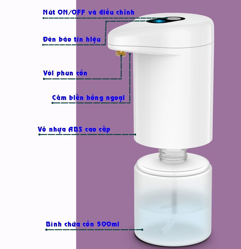 Máy phun cồn khử trùng diệt khuẩn không tiếp xúc trực tiếp, không nhấn, không chạm tay vào bình, máy tự động nhận diện tay bạn để phun dung dịch sát khuẩn theo định lượng đã cài đặt đảm bảo an toàn vệ sinh, tránh lây nhiễm vi khuẩn gây bệnh tại nơi đông người