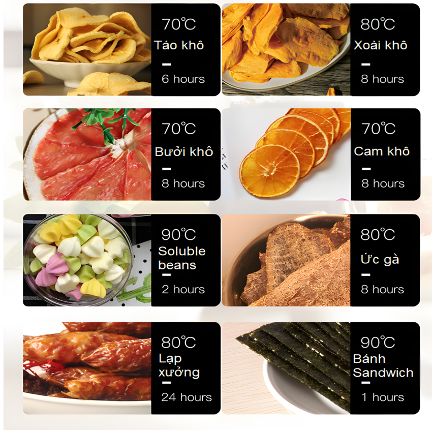 - Thời gian sấy tối đa là 24h với nhiệt độ sấy lên đến 90 đô C.