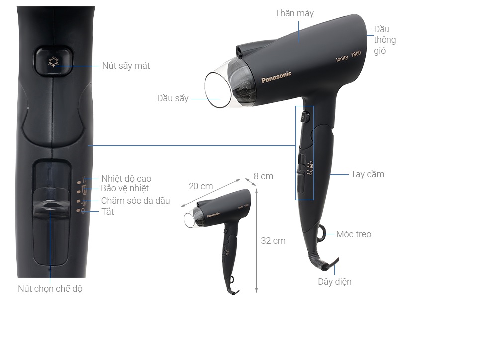 Tính năng : Tương đương với công suất sấy 2300W* Nhờ sự kết hợp cân bằng giữa luồng khí mạnh mẽ và phân phối nhiệt nên máy sấy 2000W này hoạt động hiệu quả tương đương với máy sấy 2300W*. *So với hiệu suất của máy sấy của tóc Panasonic 2300W. Hiệu suất sấy cao Cấu trúc độc đáo bên trong là bí quyết mang lại hiệu suất sấy cao cho một chiếc máy sấy nhỏ gọn. Thiết kế bên trong của máy sấy đã được cải tiến để cung cấp nhiệt độ không khí mạnh mẽ và ổn định với tốc độ quạt nhanh hơn. Chức năng sấy ion giúp duy trì độ ẩm Lỗ thoát ion được thiết kế nằm trên đầu sấy giúp bảo vệ ion tránh sức nóng của máy sấy tóc, mang lại thêm độ ẩm cho tóc. Đầu sấy tập trung 11 mm kiểu mới giúp tạo kiểu tóc chính xác và hoàn hảo Đầu sấy tập trung 11 mm kiểu mới của Panasonic giúp tập trung luồng khí trực tiếp lên tóc của bạn, cho phép tạo kiểu tóc chính xác và đơn giản hơn. Chế độ bảo vệ nhiệt giúp ngăn ngừa hiện tượng quá nhiệt Tóc và da đầu sẽ được sấy khô ở nhiệt độ tối ưu, giúp bảo vệ tóc không bị quá nóng. Khám phá những tính năng khác Tay cầm có thể gập gọn Tay cầm có thể gập gọn, cho phép cất gọn máy sấy khi không sử dụng và lý tưởng cho việc sử dụng khi đi du lịch. Gọn nhẹ & Dễ cầm nắm Với thiết kế tiện dụng, máy sấy tóc có trọng lượng cân đối, mang đến trải nghiệm sấy tóc ổn định và thoải mái.