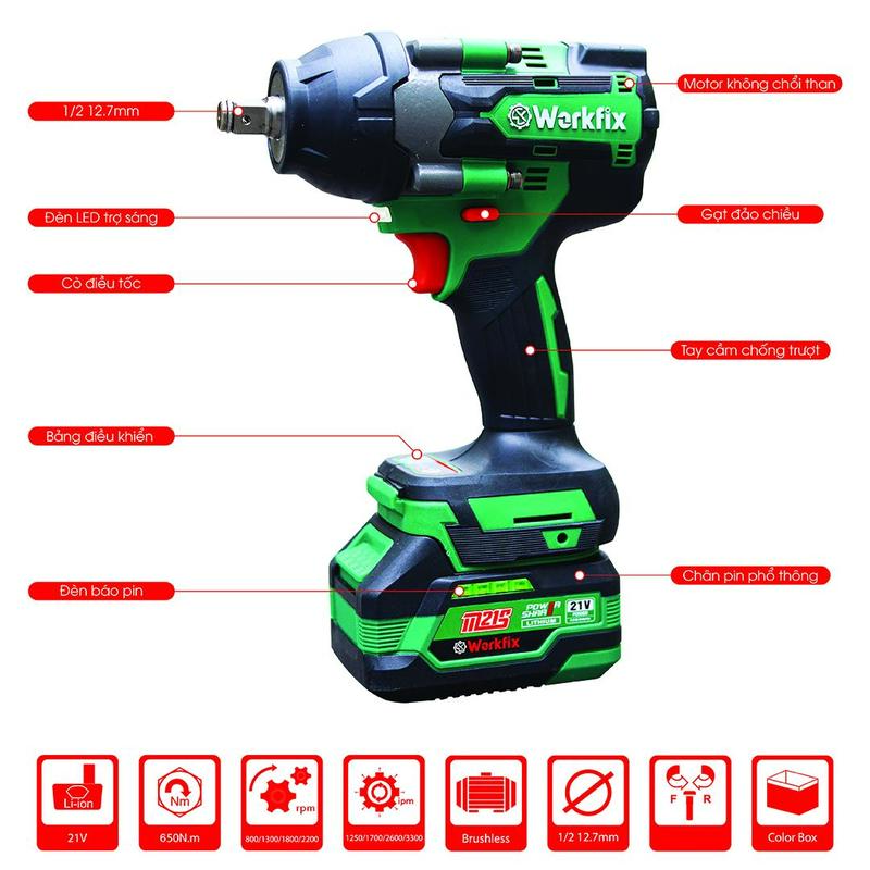 Máy Siết Bulong Workfix 650N.m 2 Pin 21V/4Ah PLUS - IW650NBL - Lực Siết 650N mở ốc lớn - 4 Cấp Tốc Độ - Motor Brushless - Chân Pin Phổ Thông PLUS - Bảo Hành Chính Hãg 6 Tháng