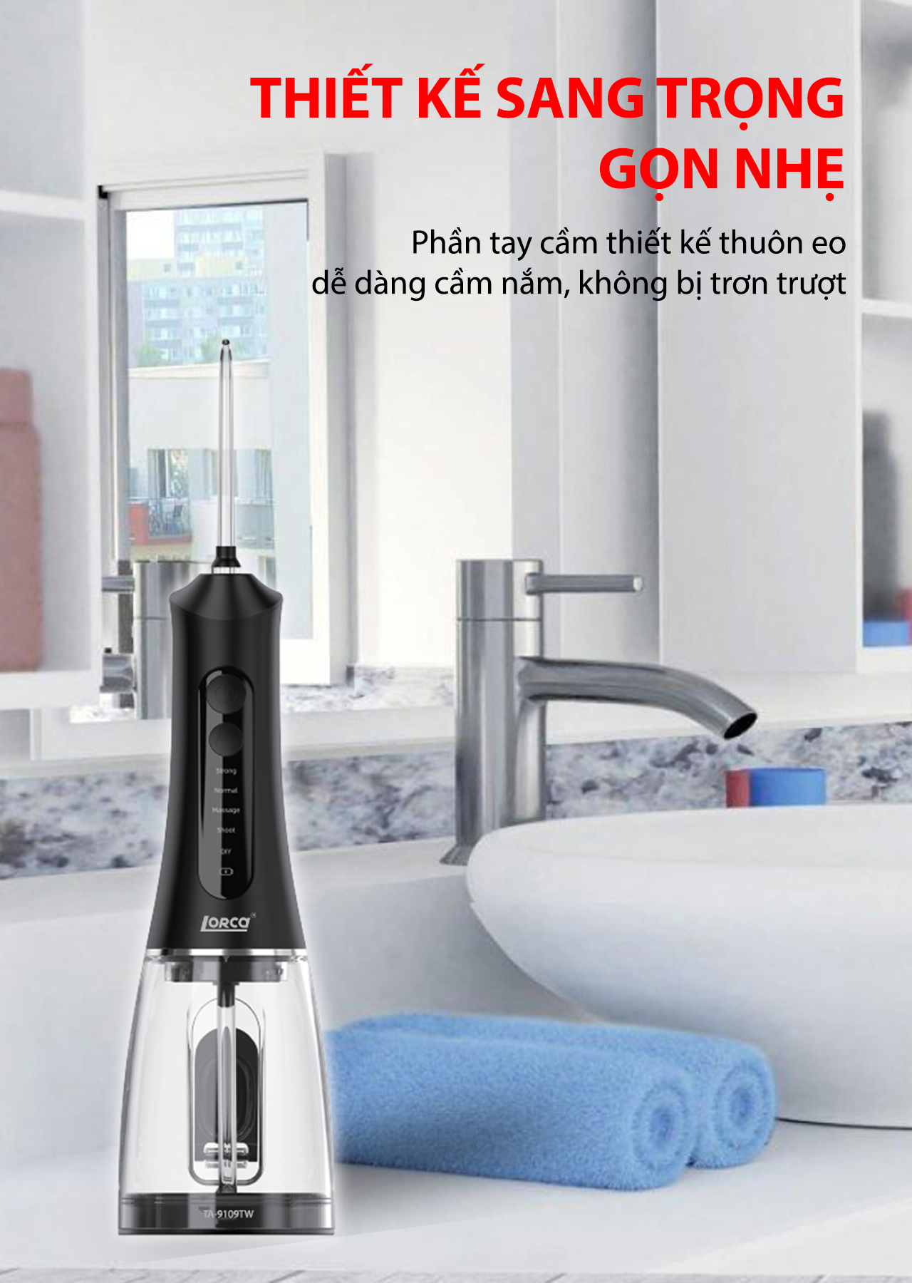 - Tăm nước Lorca TA-9109WT là thiết bị chăm sóc răng miệng hiện đại, ứng dụng công nghệ phun sóng âm tiên tiến, giúp làm sạch răng miệng hiệu quả và tiện lợi. Sản phẩm này không chỉ mang lại hiệu quả vệ sinh cao mà còn đảm bảo an toàn, dễ sử dụng, phù hợp với mọi thành viên trong gia đình. Dưới đây là các tính năng nổi bật của Tăm nước Lorca TA-9109WT: Tính năng sản phẩm: