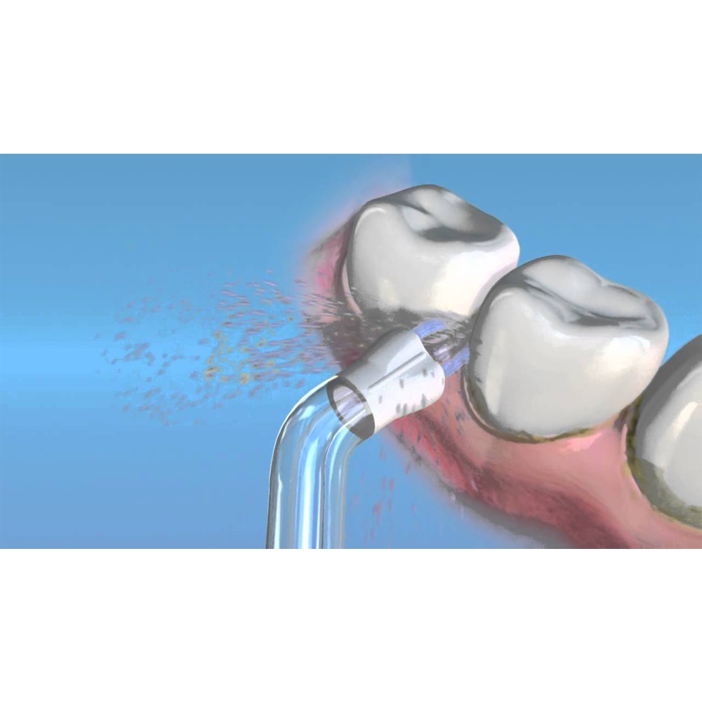 - Đặt tia nước của đầu phun ở vùng kẽ răng trong 10s, rồi lần lượt chuyển qua vùng kẽ răng khác