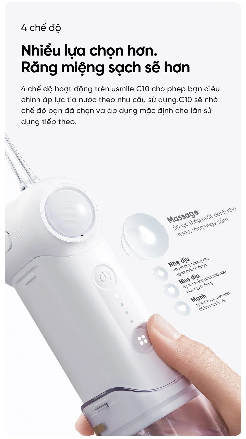 4 chế độ hoạt động tương đương với 4 mức áp lực nước khác nhau, usmile C10 phù hợp cho nhiều tình trạng răng và mục đích sử dụng của người dùng.