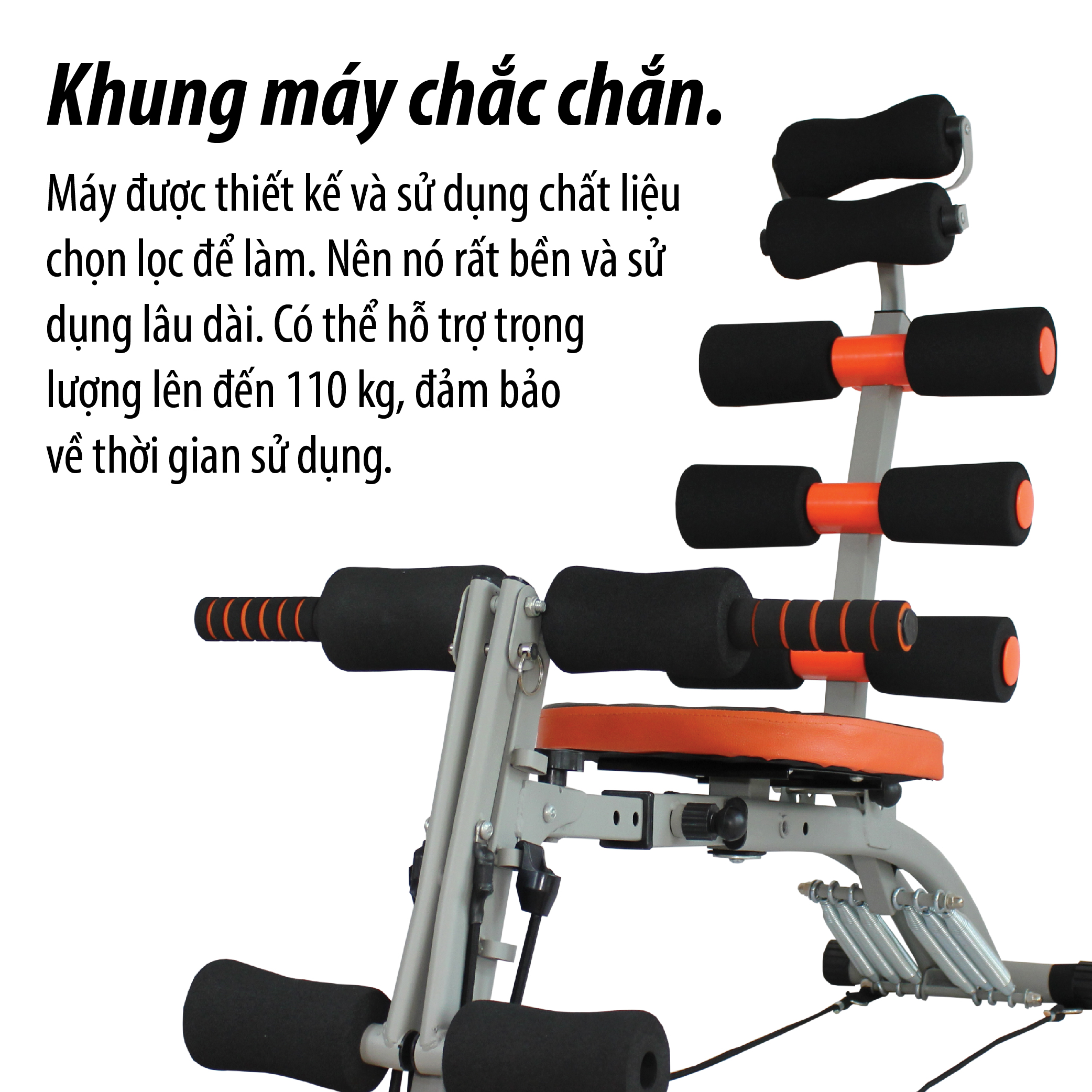 Máy tập cơ bụng đa năng Six Pack Care giúp bạn giảm lượng mỡ dư thừa ở vòng 2. Chỉ cần bạn tập động tác gập ngã người thì nhóm cơ bụng trên, bụng giữa, bụng dưới và cơ chéo hai bên hông được căng giãn một cách tối đa nhờ có sử dụng 2 cặp lò xo kéo làm tăng hiệu quả tập. Ngoài ra, máy được thiết kế dây kéo tay và thanh đỡ tập cơ bắp chân, độ rộng ghế ngồi thoải mái, vừa tạo nét thẩm mỹ vừa có khả năng chịu lực giúp bạn có thể dễ dàng thực hiện động tác hít đất, tập riêng cho cơ cánh tay.