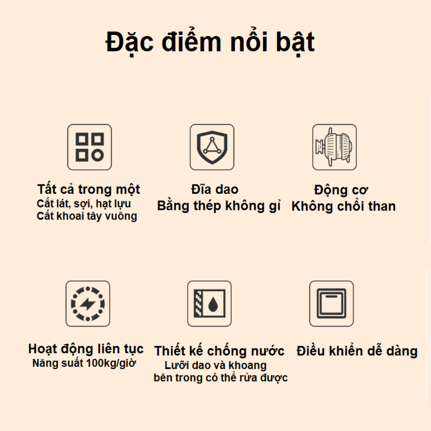 Ưu điểm nổi bật - Động cơ đồng nguyên chất, không chổi than - Công suất lớn 850W - Hai động cơ độc lập: Động cơ thái và động cơ băng tải - Lưỡi dao