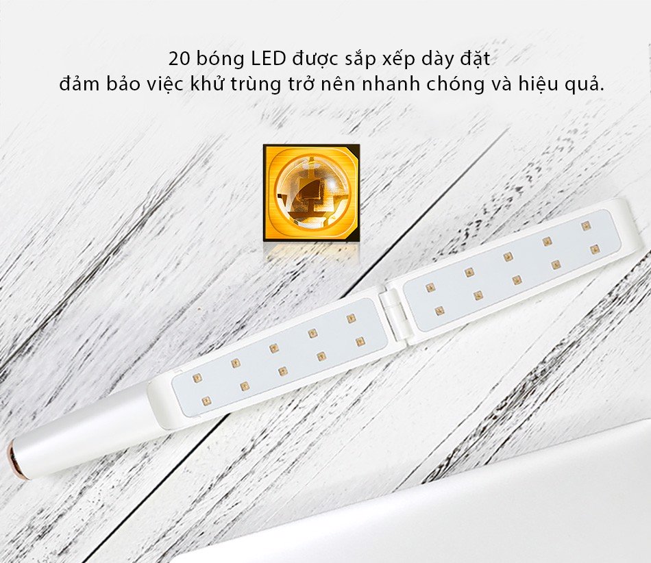 Với 20 bóng đèn LED được sắp xếp dày đặt đảm bảo việc khử trùng trở nên nhanh chóng và hiệu quả. Các tia cực tím được phát ra từ chip đèn tiêu diệt tế bào ADN của vi khuẩn bằng các tác nhân vật lý. Không sản sinh nhiệt, không độc hại, không làm biến dạng vật dụng.