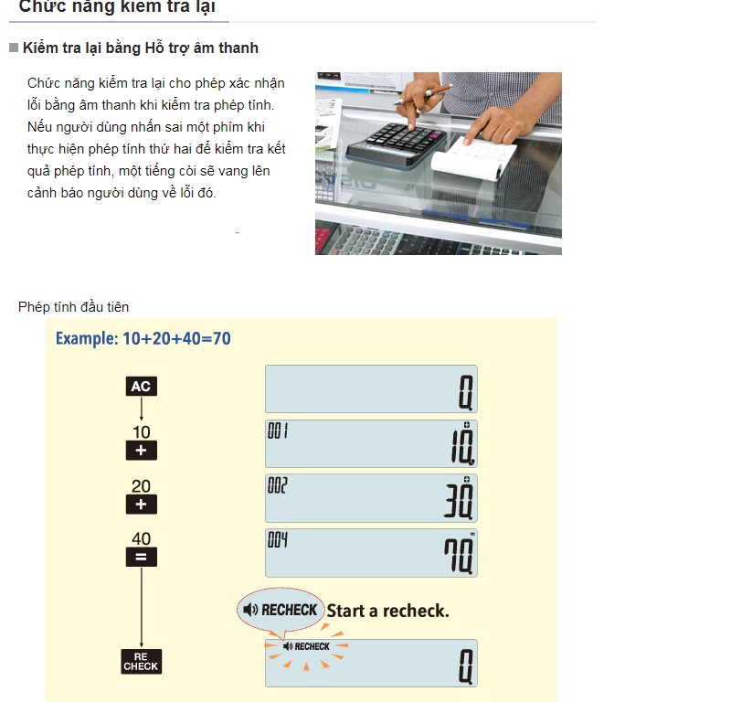 Chức năng kiểm tra lại cho phép xác nhận lỗi bằng âm thanh khi kiểm tra phép tính. Nếu người dùng nhấn sai một phím khi thực hiện phép tính thứ hai để kiểm tra kết quả phép tính, một tiếng còi sẽ vang lên cảnh báo người dùng về lỗi đó.