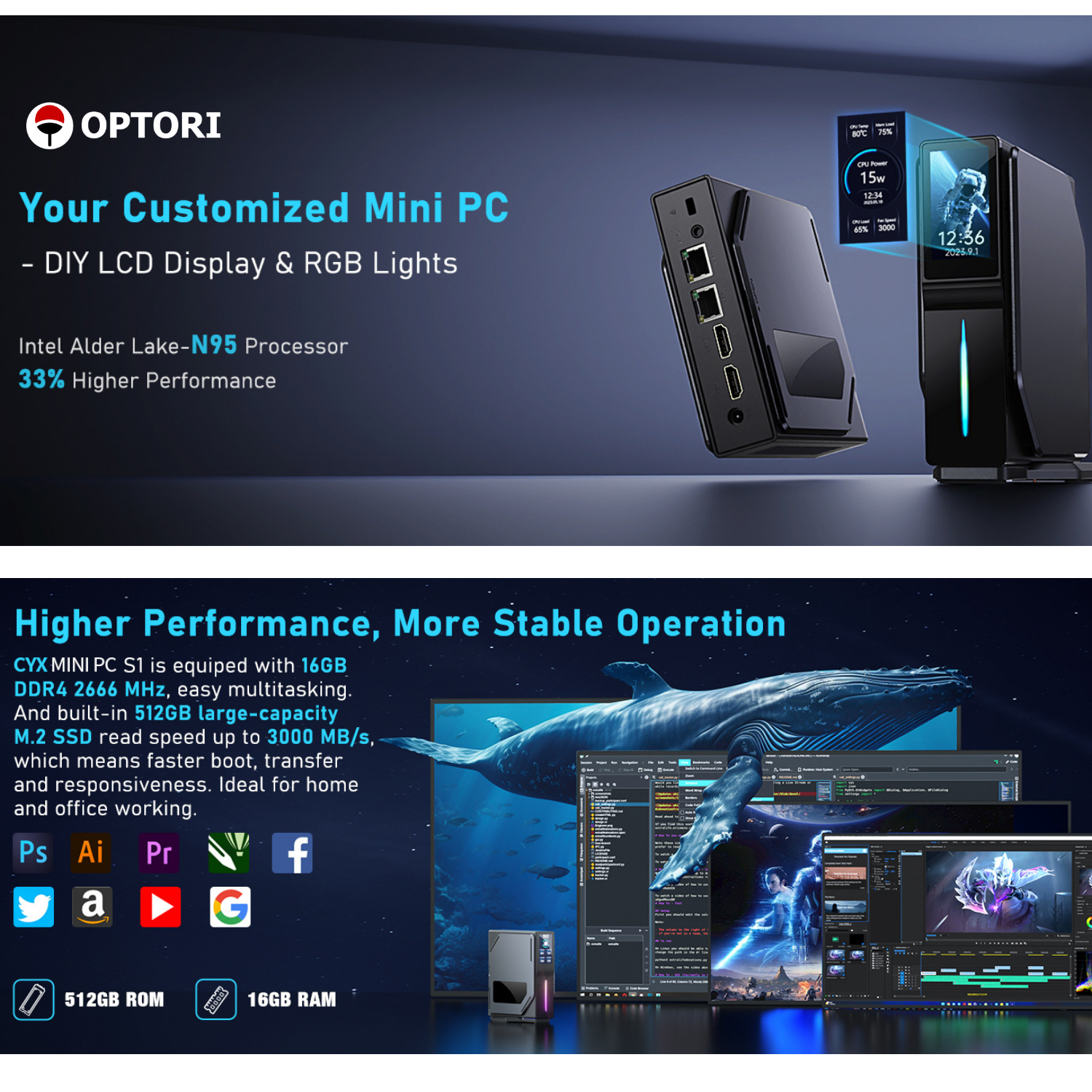 Đặc biệt Mini PC JK01 thiết kế giao diện màn hình LCD cho phép tùy chỉnh theme, cùng LED RGB đẹp mắt trên thân máy, giúp không gian làm việc của bạn trở nên thật sống động và nổi bật
