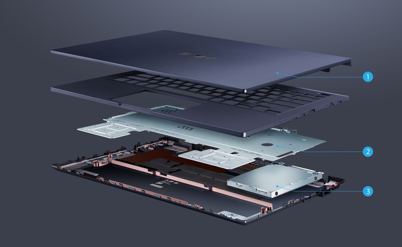 Chất lượng và độ bền bỉ đạt tiêu chuẩn quân đội Va đập trong quá trình di chuyển là rất lớn, vậy nên ExpertBook B1 được thiết kế để đáp ứng và vượt qua các tiêu chuẩn chính xác của ngành này, bao gồm cả tiêu chuẩn MIL-STD 810H vô cùng khắt khe của quân đội Mỹ. Máy được chế tạo để vượt qua những điều kiện khắc nghiệt, từ nhiệt độ đóng băng tới cái nóng héo hắt của những cơn bão sa mạc và những cú sốc do va đập hàng ngày. B1 cũng vượt qua các bài thử nghiệm nghiêm ngặt bao gồm ép tấm nền, va đập và thả rơi để đảm bảo độ bền.