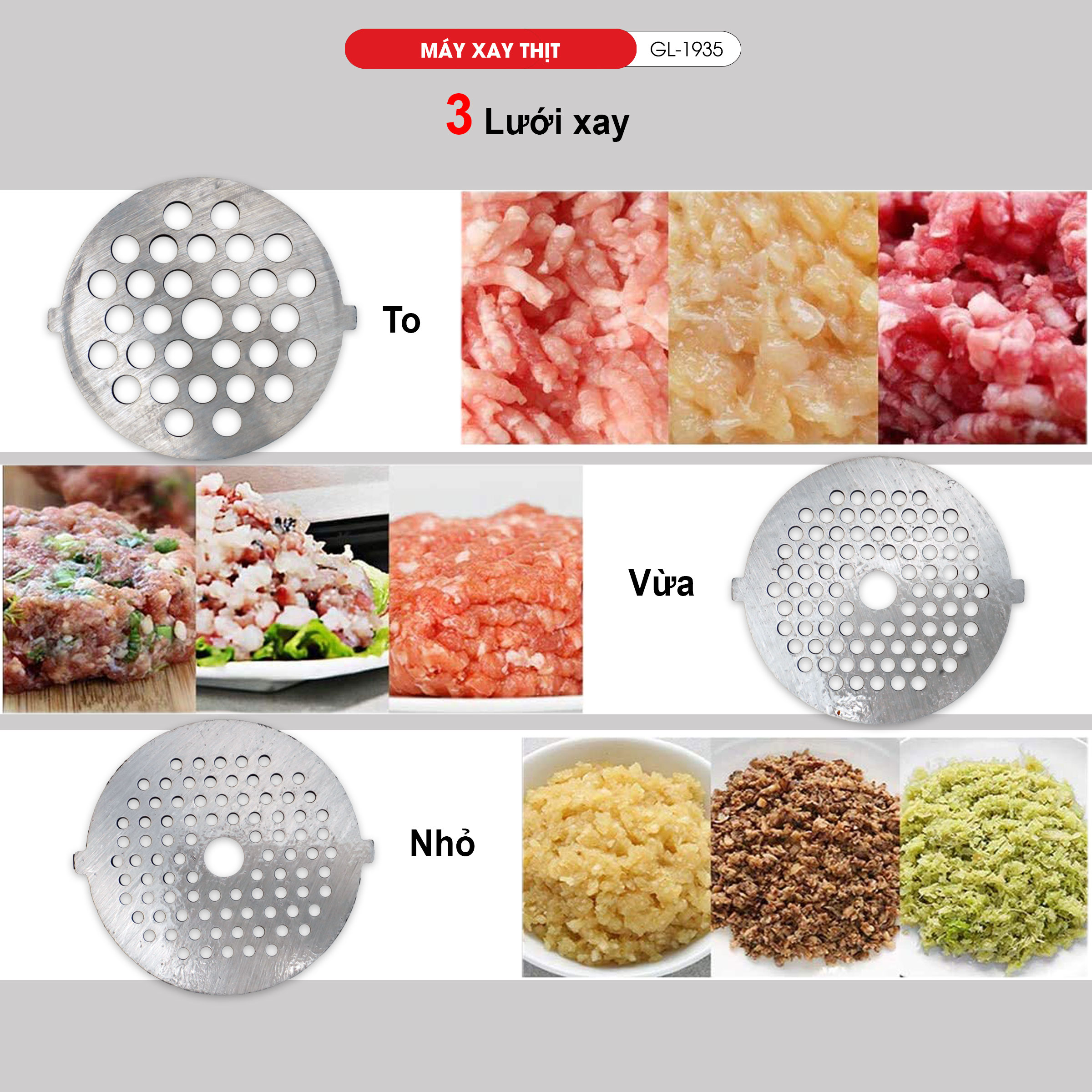 Máy Xay Thịt Gia Đình & Công Nghiệp Gali GL-1935 – Inox Cao Cấp – 1800W – Năng Suất 60-70kg/h – BH 24 Tháng Mô tả ngắn Máy xay thịt Gali GL-1935 chính hãng, công suất mạnh mẽ 1800W, vỏ inox sáng bóng, xay thịt nhanh 120–150kg/h, đi kèm 3 lưới xay và 3 ống đùn xúc xích tiện dụng. Bảo hành 24 tháng. Mô tả chi tiết sản phẩm CÔNG SUẤT MẠNH MẼ – HIỆU NĂNG VƯỢT TRỘI Được trang bị động cơ 1800W, máy xay thịt Gali GL-1935 có khả năng xay nhanh, mịn, đều mà vẫn tiết kiệm điện. Năng suất 120–150kg thịt mỗi giờ, đáp ứng cả nhu cầu gia đình lẫn sản xuất kinh doanh nhỏ, nhà hàng, quán ăn. THIẾT KẾ INOX CAO CẤP – BỀN ĐẸP THEO THỜI GIAN Vỏ ngoài và các bộ phận tiếp xúc thực phẩm được làm từ inox sáng bóng, chống gỉ sét, dễ lau chùi, đảm bảo an toàn vệ sinh thực phẩm. Kết cấu chắc chắn, hạn chế rung lắc khi vận hành. PHỤ KIỆN ĐA DẠNG – ĐÁP ỨNG MỌI NHU CẦU 3 lưới xay inox: mịn – vừa – thô, dễ dàng thay đổi độ nhuyễn của thịt hoặc các loại thực phẩm khác. 3 ống đùn xúc xích/lạp xưởng với kích thước khác nhau, hỗ trợ làm xúc xích, lạp xưởng tại nhà hoặc quy mô sản xuất. AN TOÀN – TIỆN LỢI Hoạt động ổn định, bảo vệ động cơ, tuổi thọ cao. Dễ tháo lắp để vệ sinh và bảo quản sau khi sử dụng. THÔNG SỐ KỸ THUẬT Model: GL-1935 Công suất: 1800W Nguồn điện: 220V – 50Hz Chất liệu: Vỏ và bộ phận bằng inox sáng bóng Phụ kiện: 3 lưới xay (mịn – vừa – thô), 3 ống đùn xúc xích/lạp xưởng Năng suất xay: 120–150kg/giờ Trọng lượng máy: 5.6kg Bảo hành: 24 tháng LÝ DO NÊN CHỌN MÁY XAY THỊT GALI GL-1935 Công suất mạnh – xay nhanh & mịn Chất liệu inox sáng bóng – bền đẹp, vệ sinh dễ dàng Phụ kiện phong phú – xay thịt, làm xúc xích, lạp xưởng Năng suất lớn – phục vụ gia đình & kinh doanh Hàng chính hãng – Bảo hành 24 tháng BỘ SẢN PHẨM GỒM 01 máy xay thịt Gali GL-1935 03 lưới xay inox 03 ống đùn xúc xích/lạp xưởng Phiếu bảo hành 24 tháng Hướng dẫn sử dụng ĐẶT NGAY HÔM NAY để sở hữu máy xay thịt Gali GL-1935 – trợ thủ đắc lực cho gian bếp gia đình và cơ sở kinh doanh của bạn!