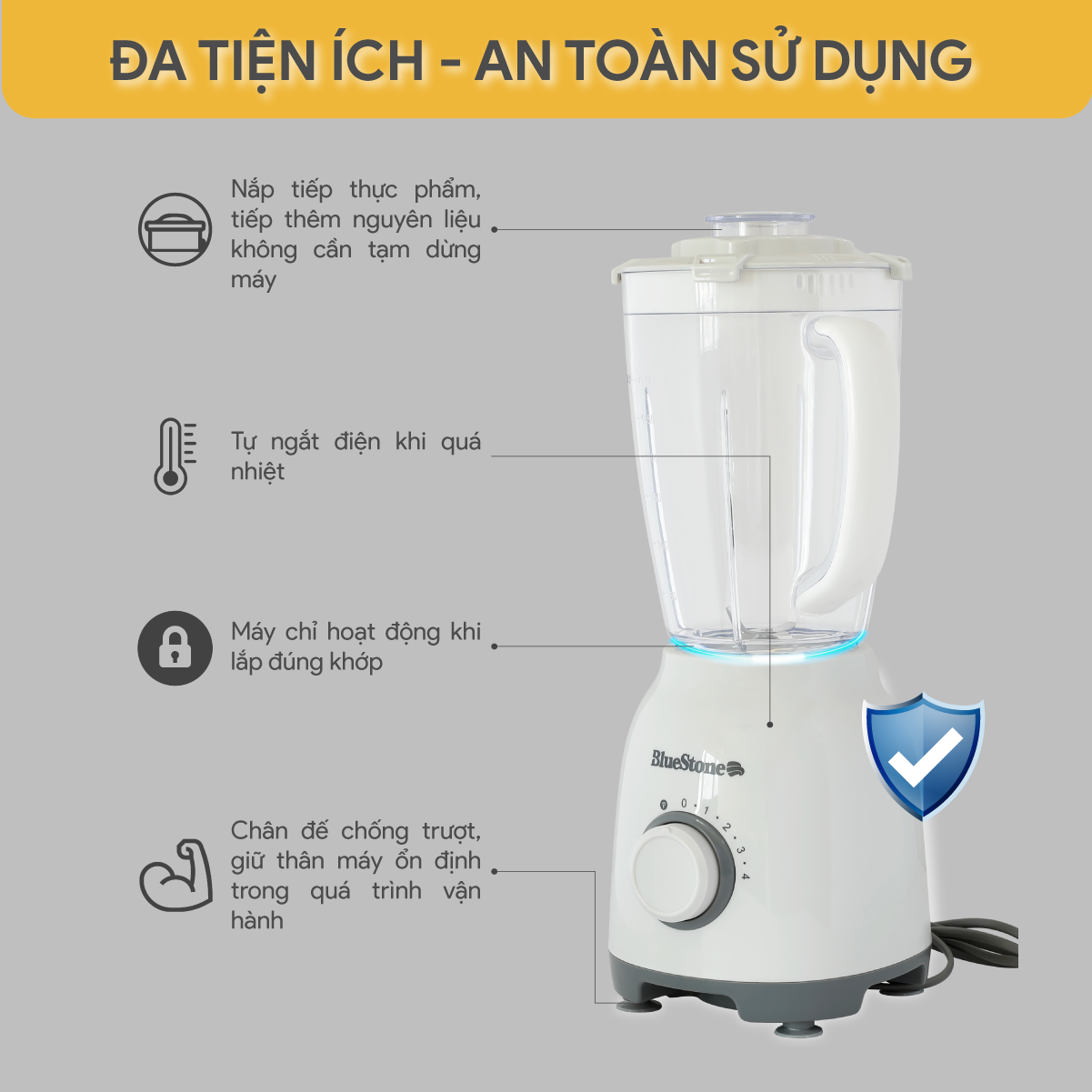 An toàn: máy chỉ hoạt động khi cối xay được lắp đúng khớp, máy được trang bị tính năng tự ngắt khi quá nhiệt