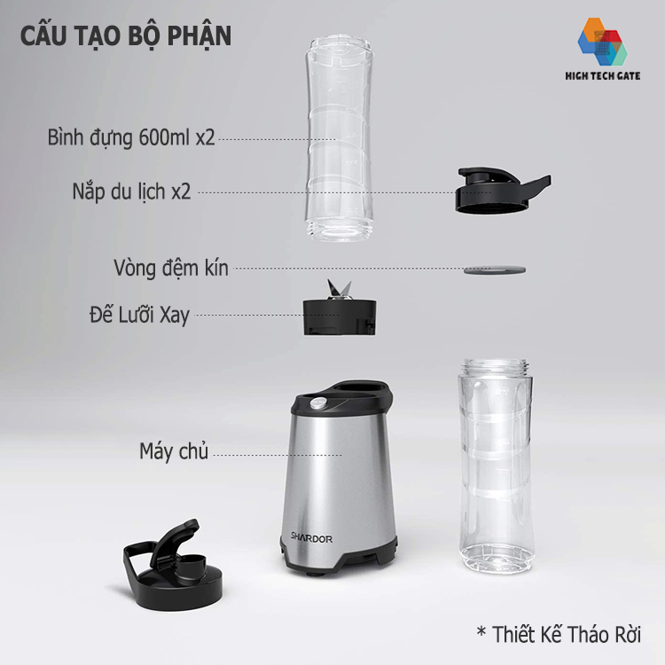 Giới thiệu sản phẩm Nếu sinh tố và các đồ uống đá xay là niềm yêu thích mỗi ngày của bạn, bổ sung vitamin cần thiết cho mỗi thành viên gia đình. Máy xay sinh tố Shardor PB615B mix and go là một lựa chọn không thể bỏ qua, đi kèm với 2 bình du lịch có nắp chống rò rỉ để bạn có thể thuận tiện mang theo đồ uống yêu thích của mình đến lớp hoặc nơi làm việc. 1 click - 10 giây xay nghiền Một cú chạm đơn giản được thực hiện. Máy xay sinh tố Shardor PB615B mix and go cho phép bạn pha chế các loại đồ uống mịn màng, đồng đều theo độ đặc và hương vị mong muốn mọi lúc, bất kể bạn chọn sử dụng loại trái cây hay rau củ nào. ĐẶC ĐIỂM NỔI TRỘI Đế chống trượt, an toàn và bền bỉ. Đế chống trượt giúp máy xay giữ ổn định khi trộn. An toàn để sử dụng. Nó có tác dụng hút dính bề mặt phẳng khi đặt lên. Lưỡi xay inox chống rỉ sét 4 cánh Công suất mạnh mẽ 300W với tốc độ 24000 vòng/phút, và hệ thống xay nghiền lưỡi 4 cánh được tích hợp trong Máy xay sinh tố Shardor PB615B có thể nhanh chóng nghiền nát bất cứ trái cây và đá nào bạn cho vào máy xay sinh tố. Tích hợp 2 bình đựng du lịch dung tích lớn 600ml Máy xay sinh tố Shardor PB615B với 2 bình đựng Tritan - không chứa BPA và 2 Nắp Du lịch miễn phí, tuyệt vời cho chuyến du lịch, công tác, thể thao ngoài trời, phòng tập gym hay văn phòng. Nắp đậy bình kín kẽ, chống rò rỉ khi mang đi Chất liệu không chứa BPA, an toàn, bền và dày đặc.  Giữ nguyên mùi vị và hương thơm ban đầu của đồ uống khi xay xong, để đảm bảo sức khỏe cho người sử dụng. HƯỚNG DẪN SỬ DỤNG Sách hướng dẫn được HTG biên soạn bao gồm TIẾNG ANH & TIẾNG VIỆT được đính kèm bên trong hộp máy, quý khách hàng vui lòng tham khảo kĩ trước khi sử dụng LƯU Ý KHI SỬ DỤNG - Không vệ sinh đế máy chủ với nước, không được làm ướt - Vệ sinh tháo rời từng bộ phận nên lưu ý lưỡi xay để tránh gây tổn thương