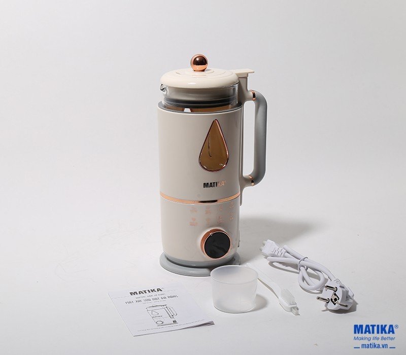 - Vệ sinh: Cho một ít nước vào giữa các đường trên và dưới. Kết nối với nguồn điện, chạm vào phím chức năng để chọn chức năng làm sạch. Sau 2 phút, máy sẽ hoàn thành chương trình làm sạch và tự động ngắt. NẤU NHANH HƠN, MẠNH HƠN NHỜ CÔNG SUẤT LỚN Máy xay sữa hạt đa năng MTK-3150 có công suất nấu 500W, công suất xay 250W – Công suất mạnh nhất trong dòng máy xay/nấu sữa hạt đa năng có trên thị trường hiện nay. Công suất mạnh nhưng không gây ồn, đáp ứng được các tiêu chí “nhanh – tiện – hiệu quả”. Sản phẩm đáp ứng được tốt những yêu cầu của người dùng: tiết kiệm thời gian, chi phí. LƯỠI DAO SẮC BÉN, XAY NHUYỄN MỌI NGUYÊN LIỆU Máy xay sữa hạt đa năng Matika MTK-3150 được sản xuất với thiết kế lưỡi dao bằng inox 304 sắc bén, xoay 360 độ có khả năng xay nhuyễn mọi thực phẩm từ mềm đến cứng hiệu quả, nhanh chóng. Chính vì vậy, sẽ giúp người dùng tạo ra những ly sữa hạt thơm ngon, sánh mịn, giàu chất dinh dưỡng mà không cần xay lọc nhiều lần. CHẤT LIỆU AN TOÀN CHO SỨC KHỎE NGƯỜI DÙNG Lưỡi dao bằng inox 304 an toàn cho sức khỏe người dùng. Thân cối thủy tinh sáng bóng cao cấp. Toàn bộ các bộ phận đều được sử dụng vật liệu an toàn tuyệt đối cho sức khỏe người dùng dù ở nhiệt độ cao. Tay cầm bọc silicon êm ái, chống nóng, bo tròn dễ thao tác. Khe tản nhiệt lớn giúp làm mát động cơ, đế chống trơn silicon giảm độ ồn và cho máy hoạt động chắc chắn, bền bỉ không rung lắc. Miệng rót dễ dàng, không gây vương đổ khi cho ra cốc hoặc bát. XAY ÊM, NẤU ĐƠN GIẢN VỚI BẢNG ĐIỀU KHIỂN THÔNG MINH Mẫu thiết kế mới của Matika có cơ chế hoạt động vô cùng đơn giản nhờ sự kết hợp giữa mún xoay và đèn led tại các nút chức năng. Bạn chỉ cần xoay điều chỉnh đến chức năng cần sử dụng. Các chức năng đều hiển thị bằng tiếng Việt do đó người dùng dễ dàng chọn được chương trình mình mong muốn.Máy xay sữa hạt đa năng Matika MTK-3150 với dung tích 800ml phù hợp với nhu cầu cho gia đình 3-5 người, sử dụng linh hoạt mọi lúc mọi nơi. Máy xay sữa hạt đa năng Matika MTK-3150 là dòng sản phẩm đáp ứng đủ các tiêu chí “chất lượng – an toàn – giá tốt – tiện lợi – nhỏ gọn – đẹp sang” phù hợp với mọi nhà. Hãy liên hệ ngay với Matika để sở hữu sản phẩm tốt này ngay hôm nay. THÔNG SỐ KỸ THUẬT
