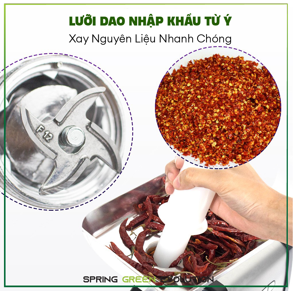 Máy xay thit sử dụng nguồn điện 220V, công suất 1300W, phù hợp với gia đình, nhà hàng