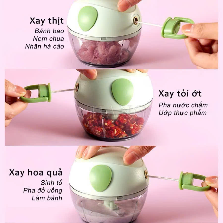 Cắt, xay nhuyễn đối với các loại hành tỏi, ớt , rau, thảo mộc, hành tây, các loại hạt...bằng tay chỉ với thao tác kéo dây cắt cực dễ và tiện Các mẹ làm đồ