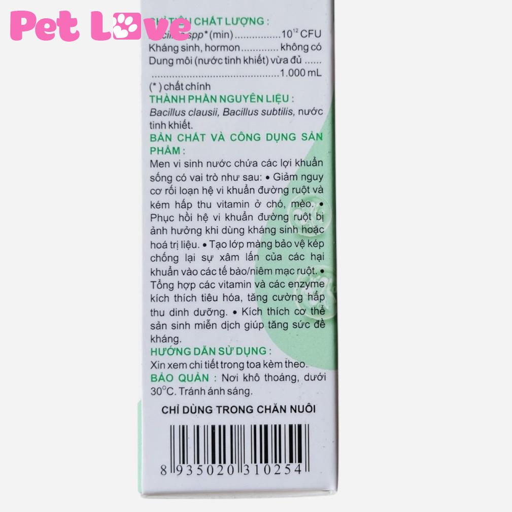 * Men vi sinh dạng nước, chứa đến 5 tỷ lợi khuẩn sống. * Hỗ trợ tiêu hóa cho chó mèo. * Sản phẩm chính hãng của công ty Vemedim. THÀNH PHẦN NGUYÊN LIỆU: Bacillus