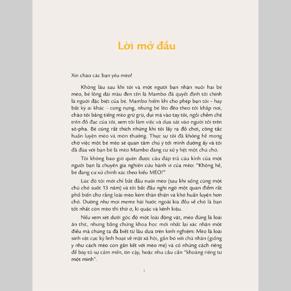 Với những tài liệu khoa học đầy thú vị cùng kinh nghiệm thực tiễn khi gắn bó với hai chú mèo cưng Mambo & Shimmy, tác giả Lili Chin khẳng định rằng: Mèo là loài sinh vật cực kỳ linh hoạt về mặt xã hội, gắn bó với chủ nhân (giống y như cách mèo con gắn kết với mèo mẹ) và có những cách riêng để bày tỏ sự cảm mến, tin cậy, hoặc nhu cầu cần “khoảng riêng tư một mình.”