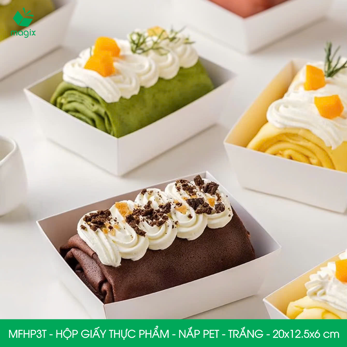 ✨MFHP3T - 20x12.5x6 cm - 100 hộp giấy thực phẩm màu trắng nắp Pet, hộp giấy chữ nhật đựng thức ăn, hộp bánh nắp trong
