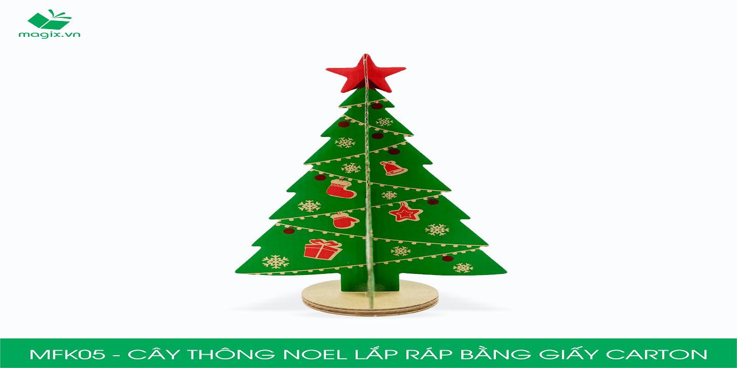 Cây thông Noel lắp ráp bằng giấy carton là một sản phẩm trang trí lý tưởng cho mùa Noel. Bạn có thể đặt sản phẩm trên bàn làm việc, ngăn tủ, kệ gỗ để trang trí. Với thiết kế đơn giản được in ấn cùng với sắc đỏ và xanh lá, sản phẩm sẽ giúp cho không gian làm việc/ trang trí của bạn đầy ấn tượng; hoặc bạn có thể dùng để làm quà tặng ý nghĩa cho các bé/ đồng nghiệp mùa Giáng sinh.