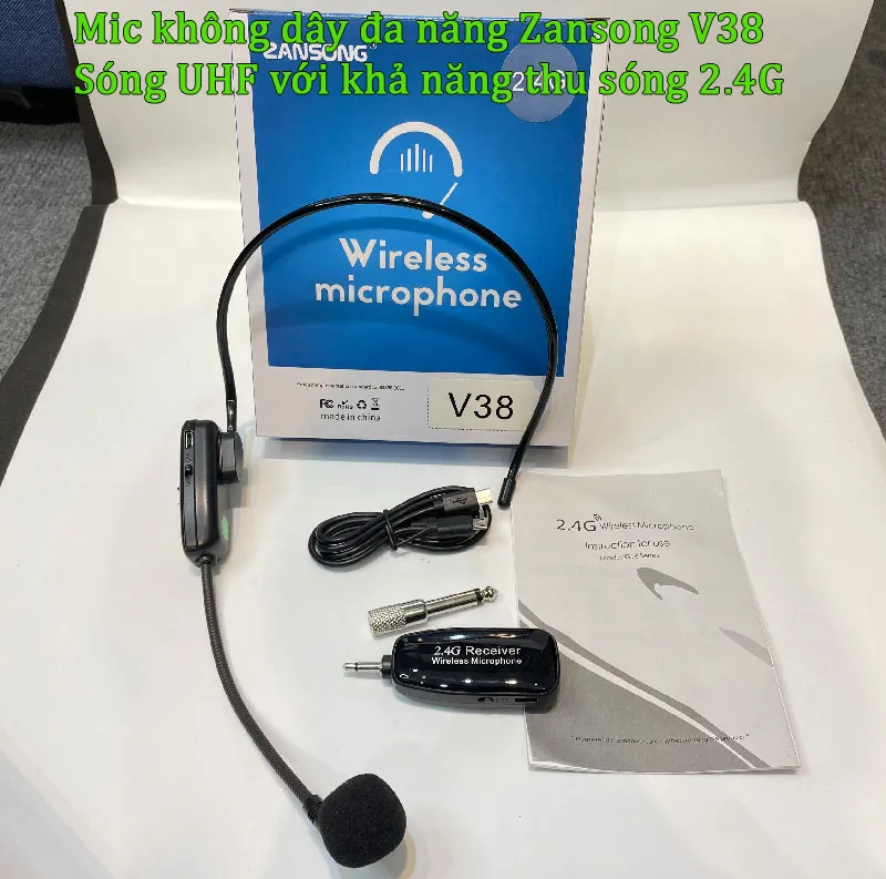 Mic không dây phát sóng 2.4G có thể xuyên tường Zansong V38 cho tất cả các loại loa có cổng mic, máy trợ giảng và nhiều loại khác. Microphone gài tai sử dụng công nghệ