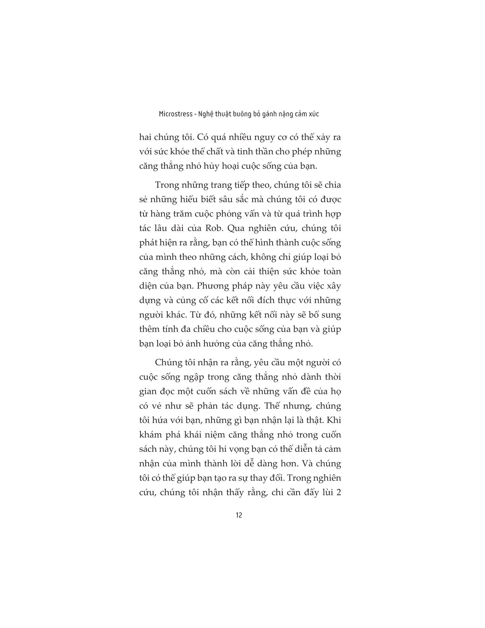 Trong Microstress – Nghệ thuật buông bỏ gánh nặng cảm xúc, Rob Cross và Karen Dillon giải thích những cơ sở khoa học đằng sau hiện tượng này, đồng thời mang đến những phương pháp xây dựng tính kiên cường trước những căng thẳng vi mô và cuối cùng là tìm ra mục đích giúp bạn thoát khỏi thế lực xâm lấn âm thầm đang cướp đi cuộc đời bạn.