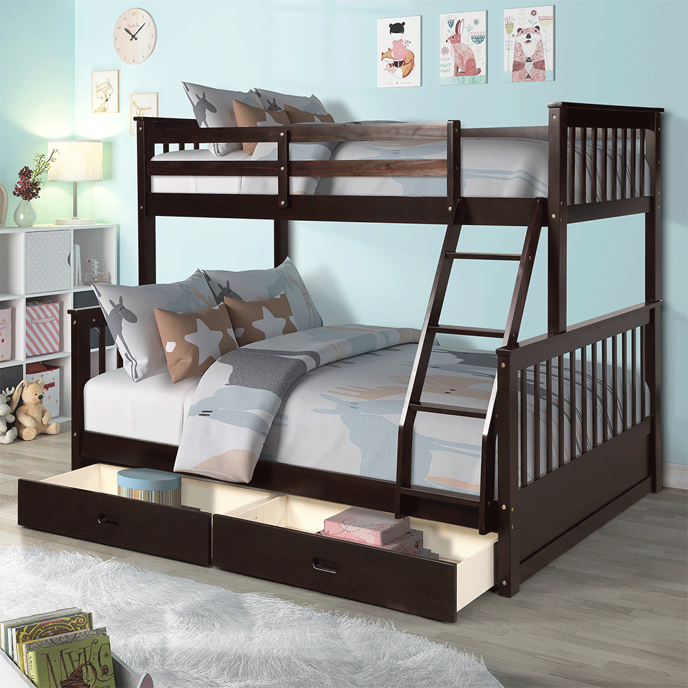 Giường tầng xuất khẩu Exeter có kích thước lọt lòng giường trên/dưới là 100x193 cm / 140x193 cm, phủ bì 206x146x165 cm. Khoảng cách giữa 2 tầng là 93 cm, cầu thang có thể đổi
