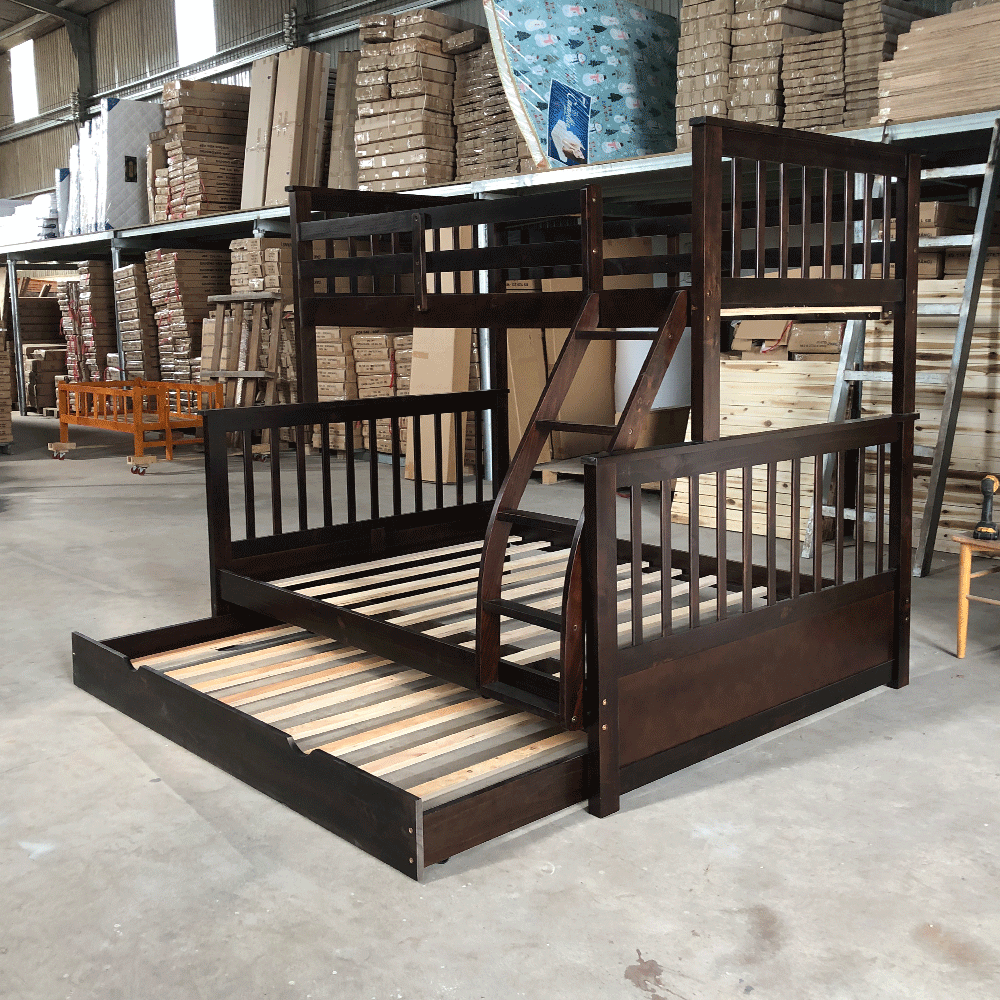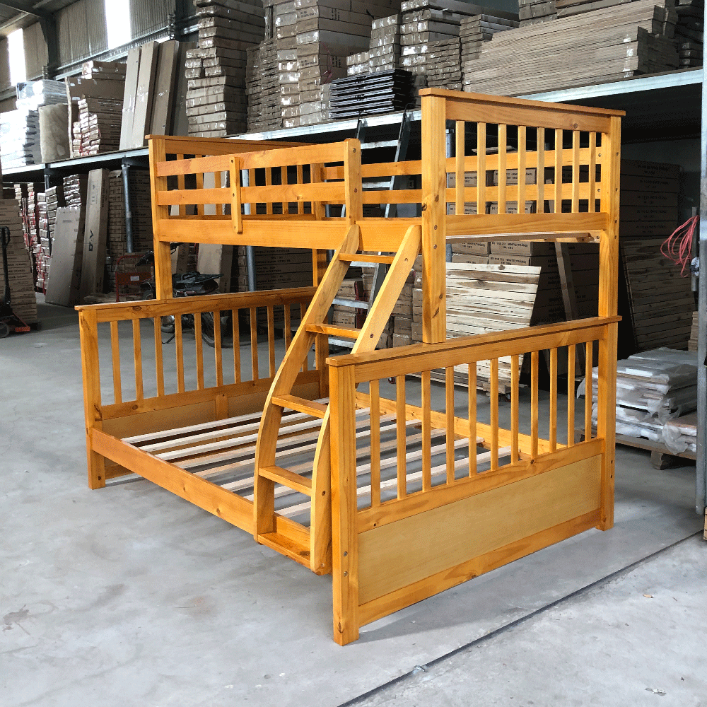 Giường tầng xuất khẩu Derby có kích thước lọt lòng giường trên/dưới là 100x193 cm / 120 x 193 cm, phủ bì 206x128x178 cm. Khoảng cách giữa 2 tầng là 98 cm, cầu thang có