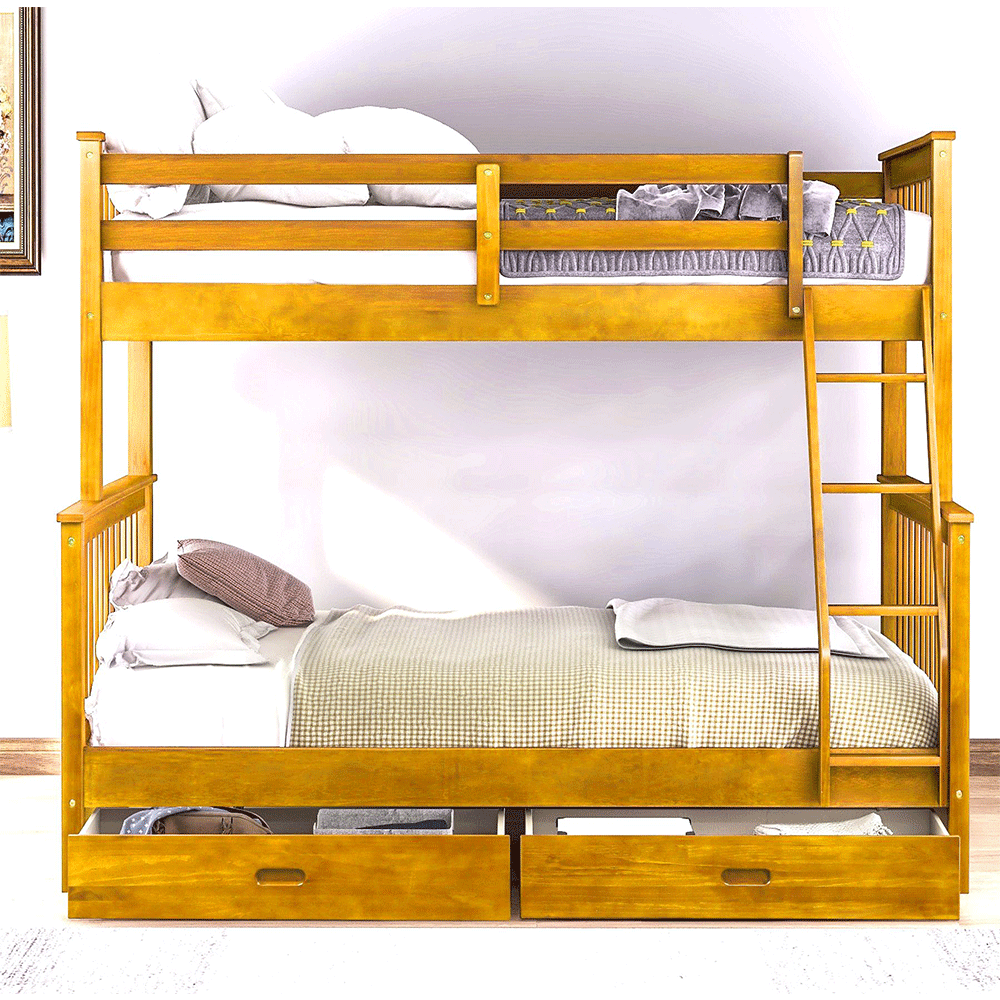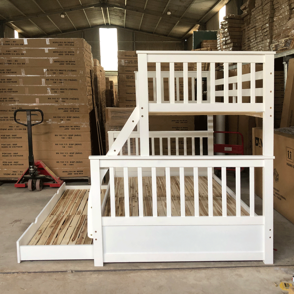 Giường tầng thấp XK Lincoln 1m2/1m2 có kích thước lọt lòng giường trên/dưới là 120x193 cm, phủ bì 208x128x90 cm, chân trụ dày 30x60 mm chịu lực tốt. Ngoài ra, giường còn tích hợp 3 ngăn kéo để đồ tiện lợi, tiết kiệm không gian. Thang giường được làm từ gỗ Plywood chắc chắn, dẻo dai với 13 thanh (cung sinh) bắt vít. Chất liệu gỗ thông xẻ sấy nhập khẩu được gia công tỉ mỉ, kết cấu chắc chắn, giúp các bé vui chơi an toàn và có những giấc ngủ ngon. Giường có 2 loại kích thước là 1m/1m và 1m2/1m2. Tùy nhu cầu, Quý khách có thể chọn loại chỉ giường để gầm thông thoáng, thêm ngăn kéo để đồ hay thêm giường kéo tăng chỗ ngủ. Kích thước DxRxC cả 2 hộc kéo là 95x11x40 cm, giường kéo là 100x185 cm. Miễn phí lắp đặt tại TP.HCM, Bình Dương, Đồng Nai.