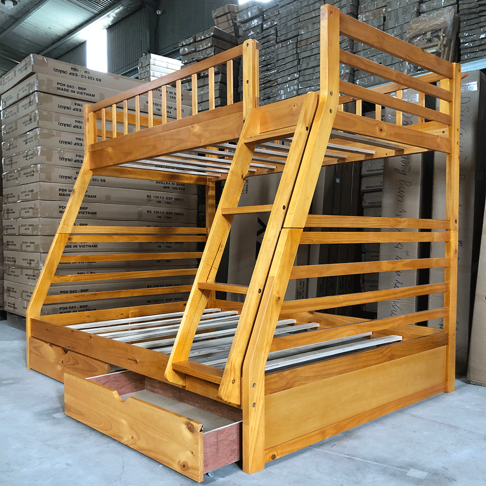 + Chất liệu: Khung giường gỗ thông Newzealand, phân tầng, Vách, đáy hộc gỗ công nghiệp, thang giường MDF chịu lực + Kích thước: kích thước phủ bì, tầng trên ưới 1mx2m Giường tầng hộp