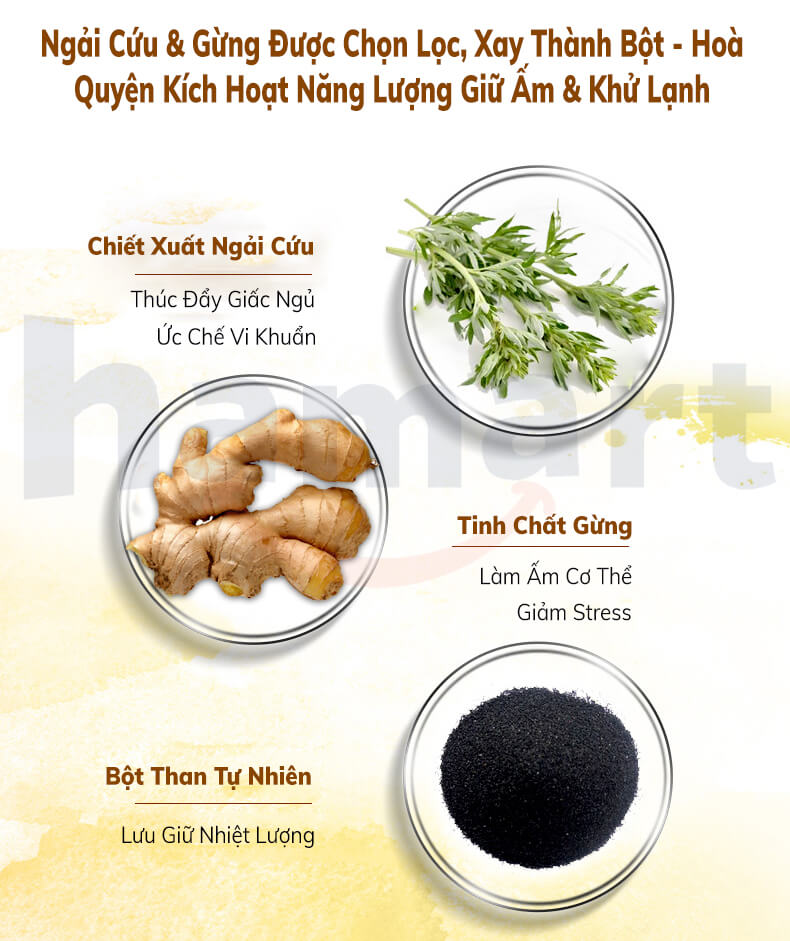 - Nguyên liệu: Hỗn hợp gừng & ngải cứu, bột sắt, than hoạt tính, muối.