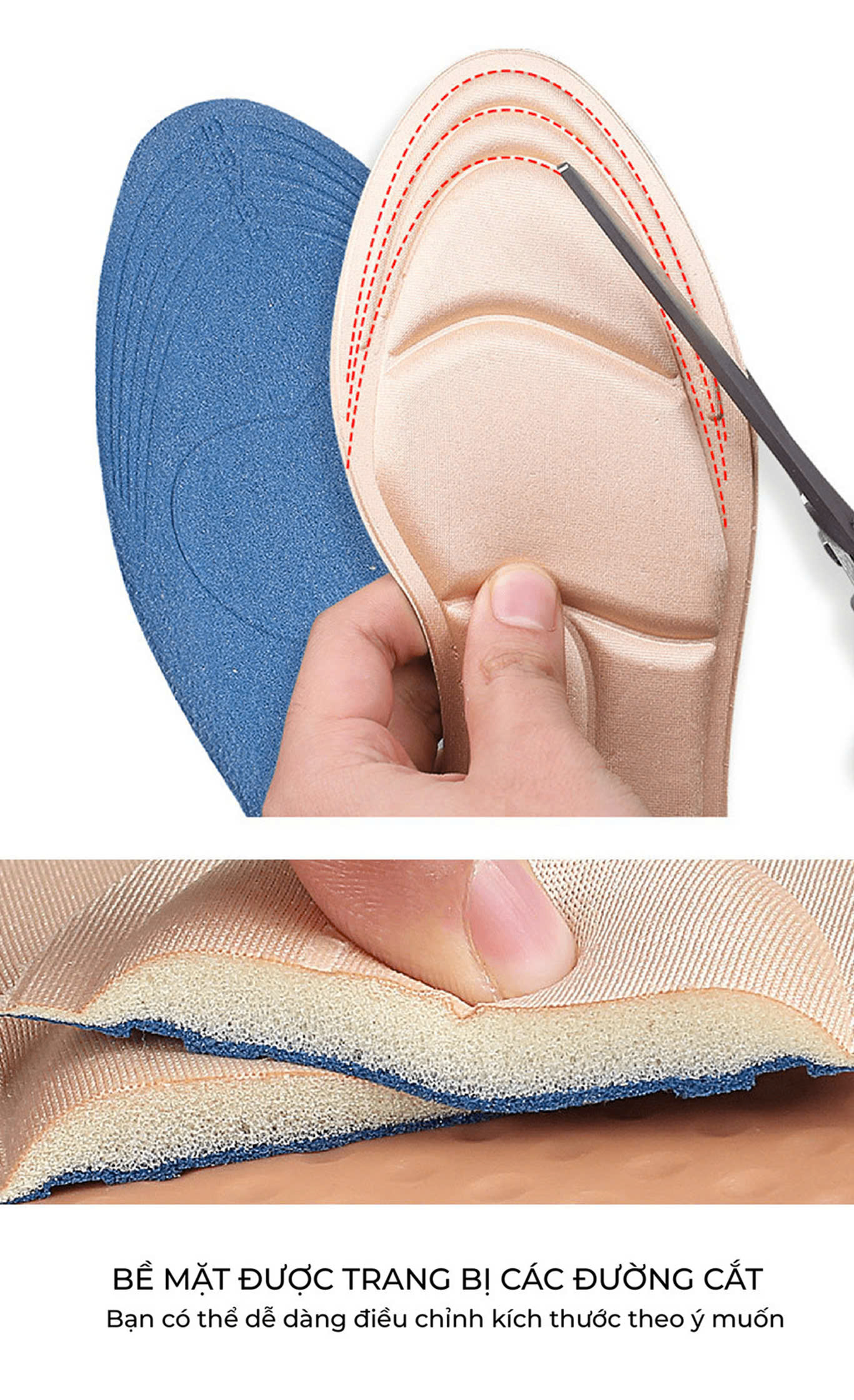 - Bước 2: Lót giày có sẵn các vạch size. Hãy chọn size phù hợp với kích thước chân của bạn và sử dụng kéo để cắt theo vạch size tương ứng.