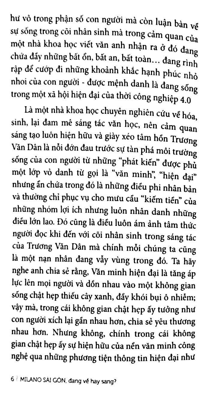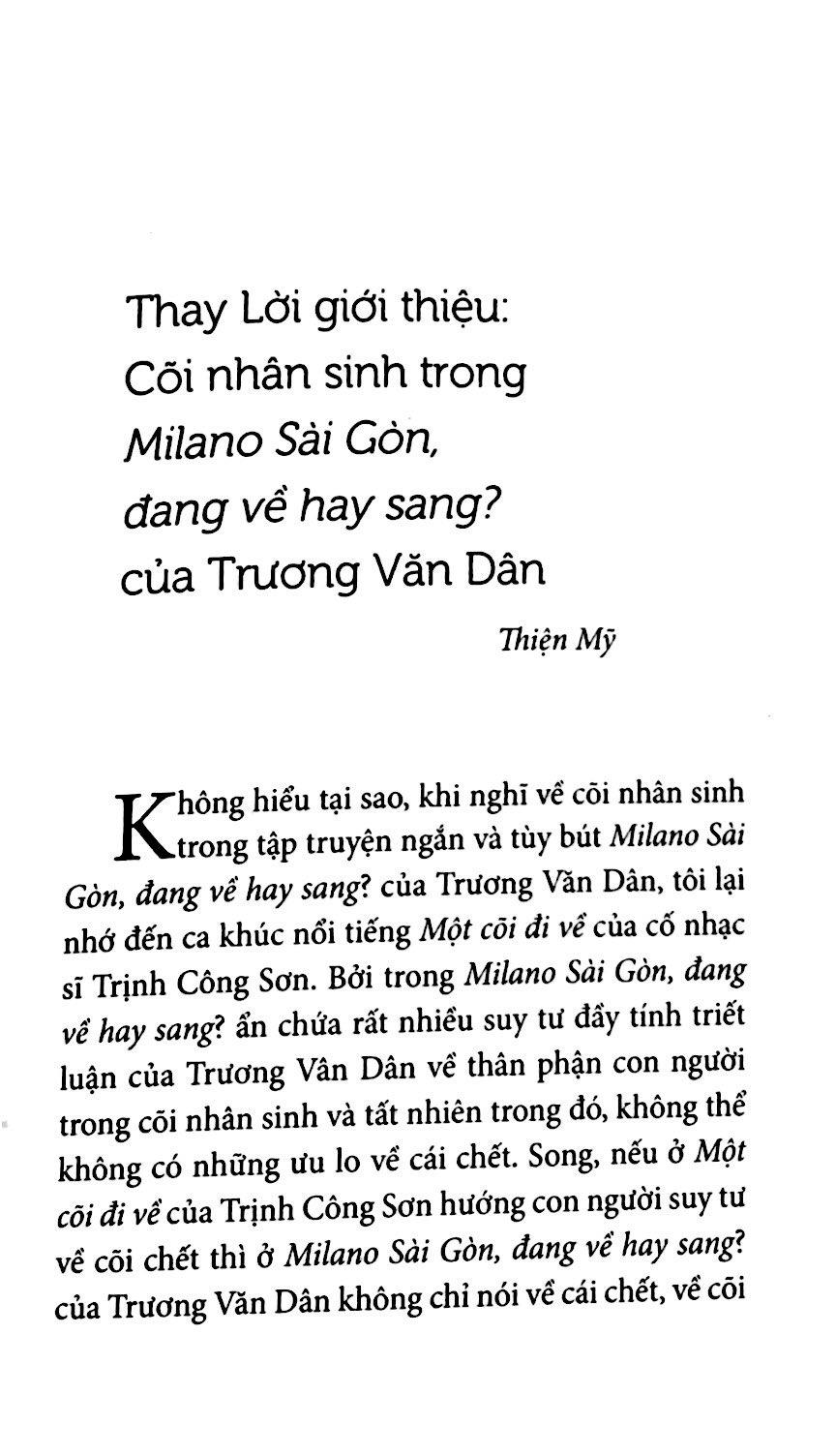 Hy vọng, đọc tác phẩm này các bạn sẽ chia sẻ với những vấn đề tác giả nói đến trong cõi nhân sinh và tìm được cho mình “một cõi đi về”. Đó là cõi đi về phía ánh sáng của tình yêu thương, lòng nhân ái và sự hướng thiện, vốn là những giá trị hằng cửu mà những tác phẩm văn học đích thực mang đến cho con người. Milano Sài Gòn, đang về hay sang? của Trương Văn Dân là một tác phẩm văn chương như thế mà tôi muốn chia sẻ như một người đọc tri âm .