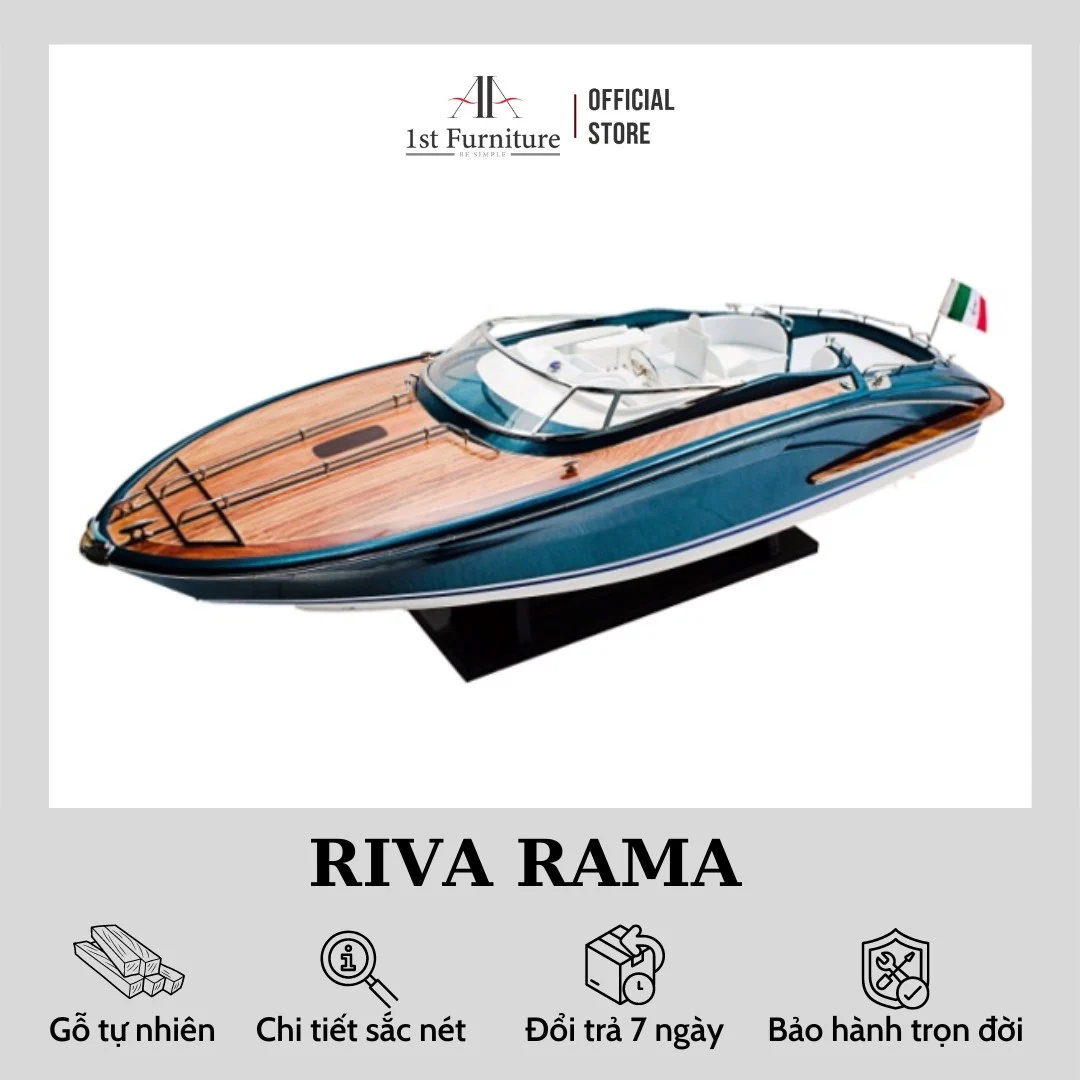 Mô hình tàu cano gỗ thuyền đua tốc độ Riva Rama trang trí được làm thủ công bằng tay và quy trình sản xuất mô hình thuyền gỗ trang trí này tương tự kỹ thuật đóng tàu thật, với từng nan gỗ nhỏ được ghép lên trên khung xương, mặt sàn được ghép bằng từng thanh gỗ xẻ nhỏ theo tỉ lệ. Trên mặt sàn hiển thị đầy đủ các chi tiết như: Xuồng cứu sinh, nắp hầm, tời, dây dù, vô lăng, lan can, cầu thang, … theo bản vẽ thiết kế của tàu thật. Lá buồm được may tỉ mỉ, dây buồm đan bằng tay với những cánh buồm no gió làm cho mô hình du thuyền hiện đại gỗ trang trí càng thêm chắc chắn và mạnh mẽ.