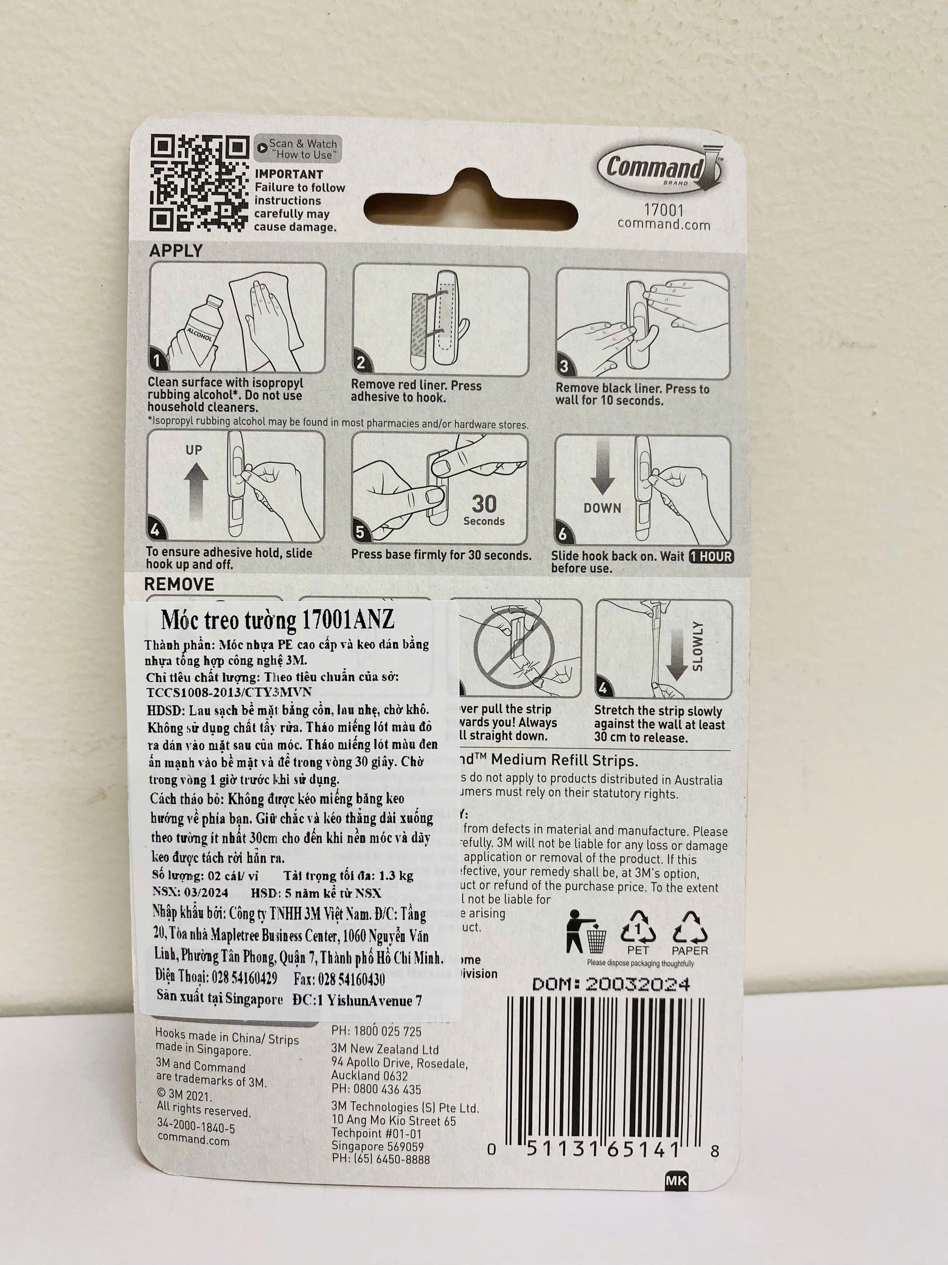 Móc dán tường kiểu vuông 3M COMMAND 17503ANZ, 1.8 kg, 1 cái/vỉ Nhãn hiệu Command thuộc tập đoàn 3M, chuyên sản xuất và cung cấp các mẫu sản phẩm dán tường có thiết kế đặc