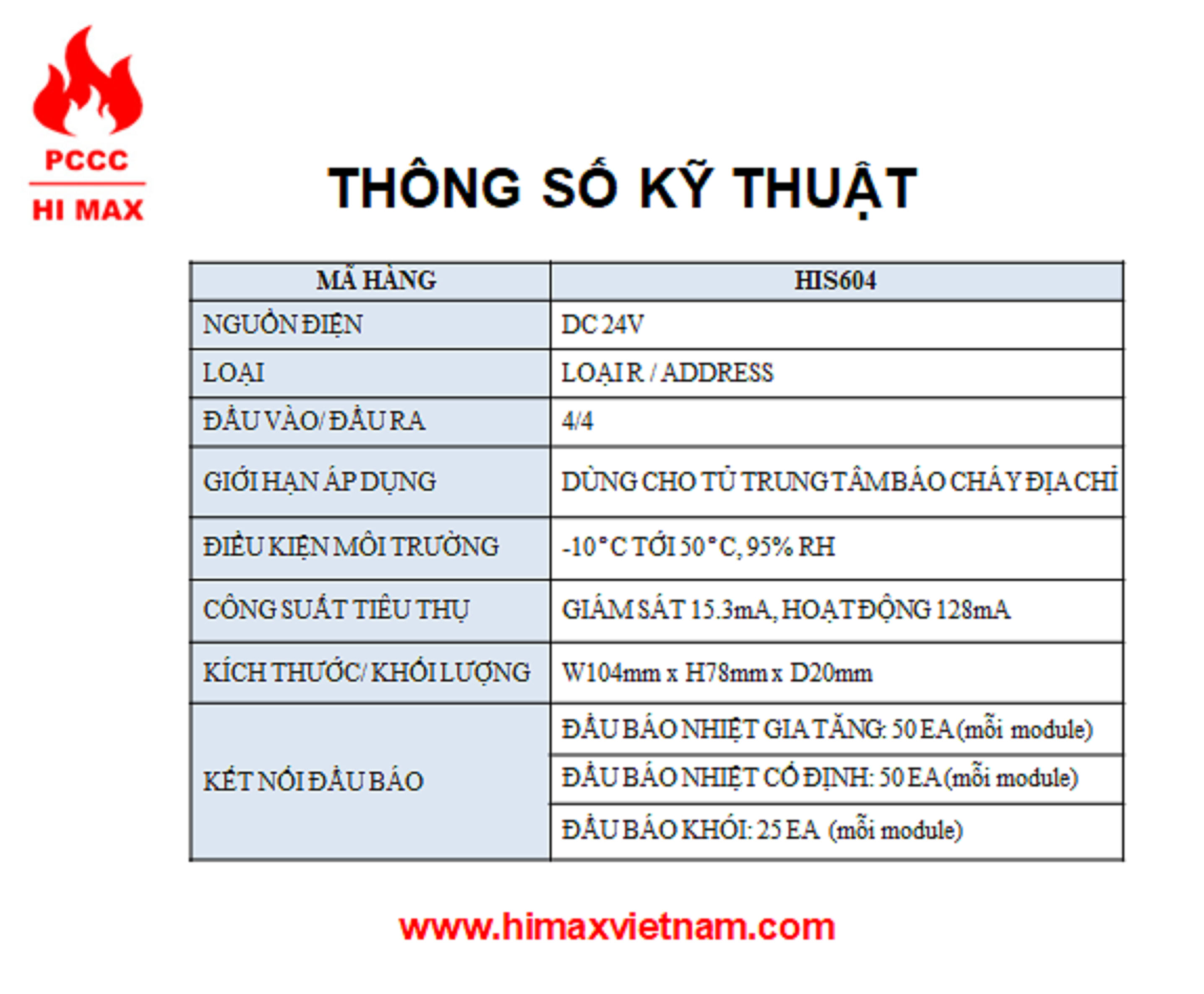 MÃ HÀNG: HIS604 NGUỒN ĐIỆN: ĐIỆN DC 24V LOẠI: LOẠI R / ADDRESS ĐẦU VÀO/ ĐẦU RA: 4/4 GIỚI HẠN ÁP DỤNG: DÙNG CHO TỦ TRUNG TÂM BÁO CHÁY ĐỊA CHỈ ĐIỀU KIỆN MÔI TRƯỜNG: