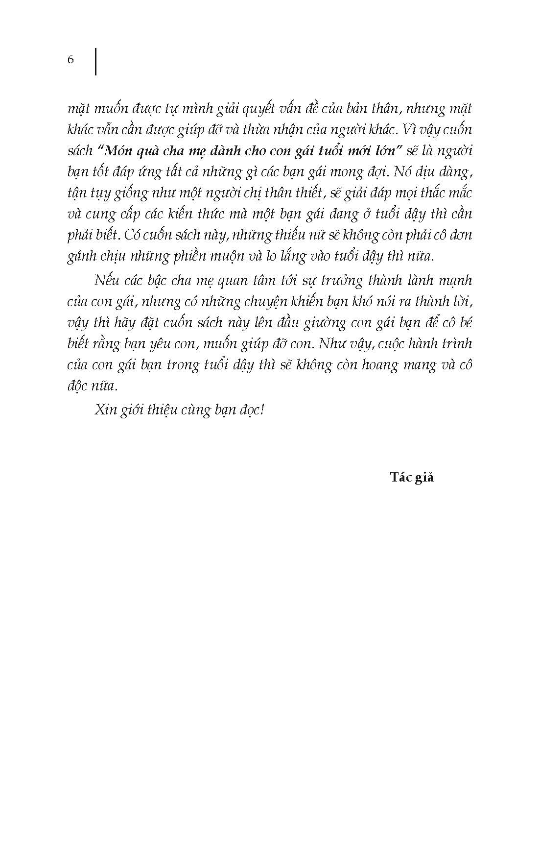 Mua tại TiktokMột cuốn cẩm nang hữu ích mà các bậc cha mẹ dành cho con gái tuổi mới lớn, cung cấp những kiến thức cơ bản, thiết thực nhất cùng những giải đáp các thắc mắc về tâm sinh lý, những vấn đề tế nhị mà các bạn nữ tuổi dậy thì thường gặp phải nhưng lại không dễ gì hỏi hay trao đổi trực tiếp với cha mẹ hay người khác, giúp các bạn vững vàng bước vào cuộc sống.