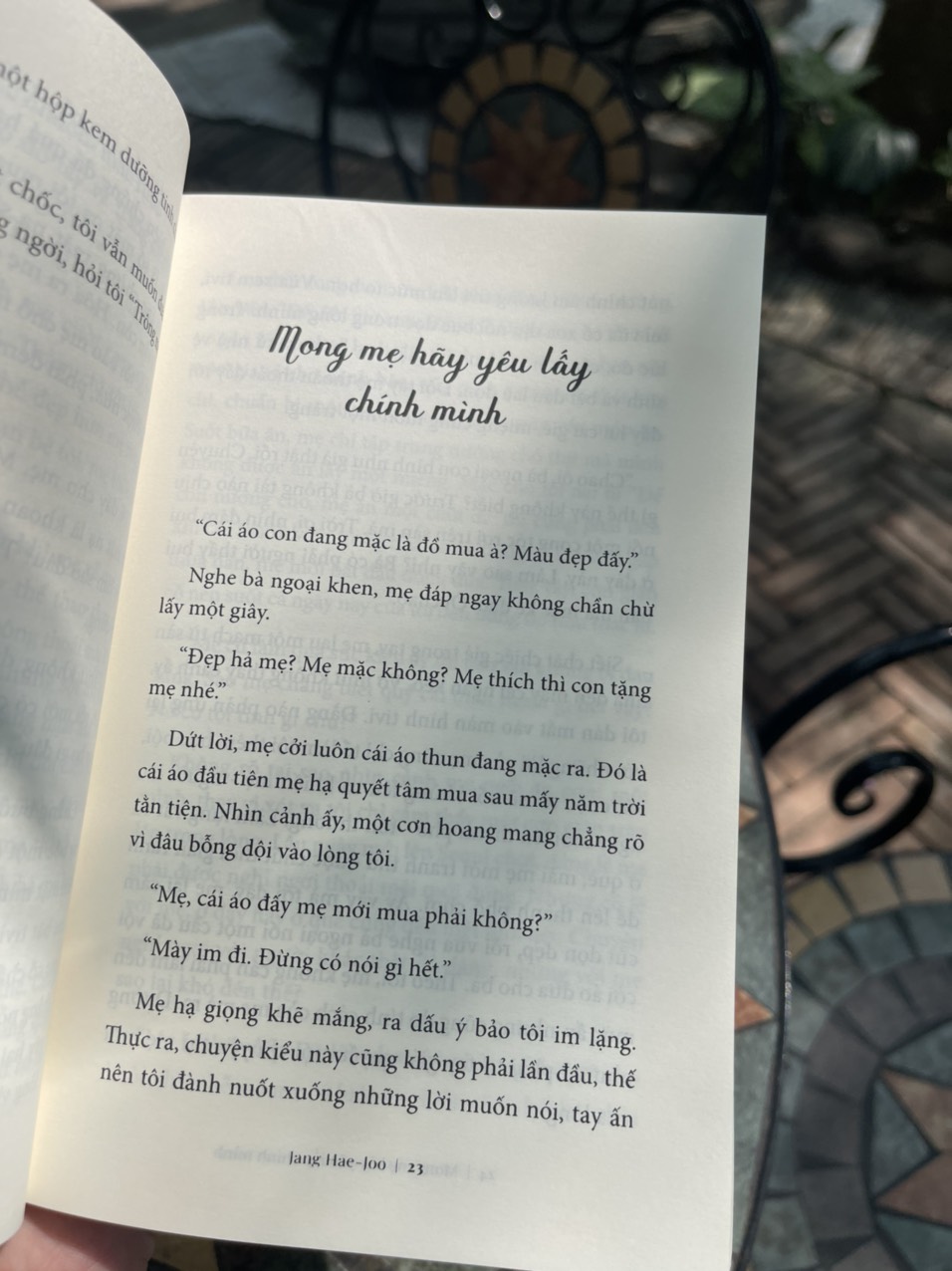 “Tôi thầm nghĩ khi đăm đăm nhìn theo bóng lưng mẹ, rằng mong mẹ hãy yêu lấy chính mình, giống như mẹ yêu tôi. Mong sao trong từng khoảnh khắc, dù là lúc rửa bát, dọn dẹp hay nấu cơm, mẹ cũng đừng quên bản thân là sự hiện diện vĩ đại, đáng quý và đẹp đẽ biết nhường nào. Tất cả những điều mẹ làm dưới danh xưng “mẹ” đều xứng đáng được trân trọng. Hy vọng mẹ trở thành một người mẹ biết khích lệ chính mình. Một người mẹ thỉnh thoảng biết tự thưởng cho bản thân, biết làm những điều tốt đẹp cho chính mình, chứ không phải hy sinh tất cả vì người khác. Một người mẹ hiểu rằng chính mình cũng phải tỏa sáng thì gia đình mới trở nên lấp lánh được.