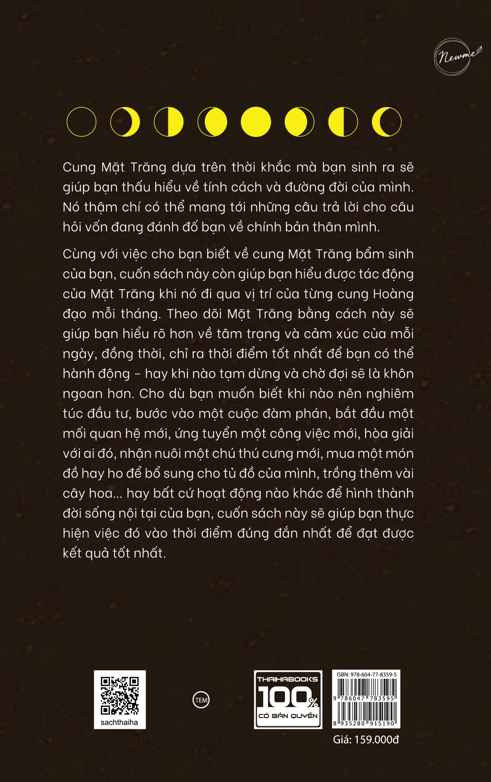 Ngay cả khi bạn không biết gì về thuật chiêm tinh, việc tìm hiểu cung Mặt Trăng dựa trên thời khắc mà bạn sinh ra vẫn sẽ giúp bạn thấu hiểu về tính cách và đường đời của mình. Nó thậm chí có thể mang tới những câu trả lời cho câu hỏi vốn đang đánh đố bạn về chính bản thân mình. Cùng với việc cho bạn biết về cung Mặt Trăng bẩm sinh của bạn, cuốn sách này cũng sẽ giúp bạn hiểu được tác động của Mặt Trăng khi nó đi qua vị trí của từng cung Hoàng đạo mỗi tháng. Theo dõi Mặt Trăng bằng cách này sẽ giúp bạn hiểu rõ hơn về tâm trạng và cảm xúc của mỗi ngày, và cũng chỉ ra thời điểm tốt nhất để bạn có thể hành động – hay khi nào tạm dừng và chờ đợi sẽ là khôn ngoan hơn. Cho dù bạn muốn biết khi nào nên nghiêm túc đầu tư, bước vào một cuộc đàm phán, bắt đầu một mối quan hệ mới, ứng tuyển một công việc mới, hòa giải với ai đó, nhận nuôi một chú thú cưng mới, mua một món đồ hay ho để bổ sung cho tủ đồ của mình, trồng thêm vài cây hoa… hay bất cứ hoạt động nào khác để hình thành đời sống nội tại của bạn, cuốn sách này sẽ cho bạn thấy cách để thực hiện việc đó vào thời điểm đúng đắn nhất để bạn có thể đạt được kết quả tốt nhất.