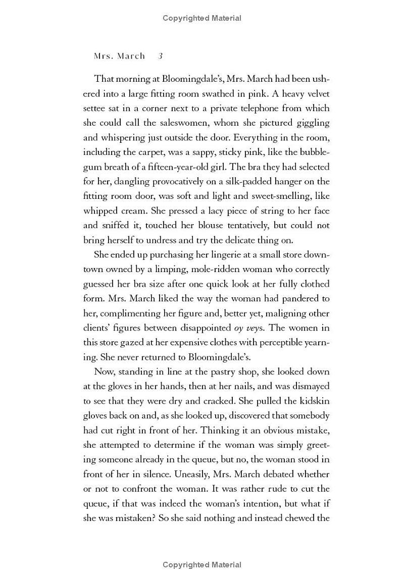 A creature of routine and decorum, Mrs. March lives an exquisitely controlled existence on the Upper East Side. Every morning begins the same way, with a visit to her favourite patisserie to buy a loaf of olive bread, but her latest trip proves to be her last when she suffers an indignity from which she may never recover: an assumption by the shopkeeper that the protagonist in George March’s new book – a pathetic sex worker, more a figure of derision than desire – is based on Mrs. March.