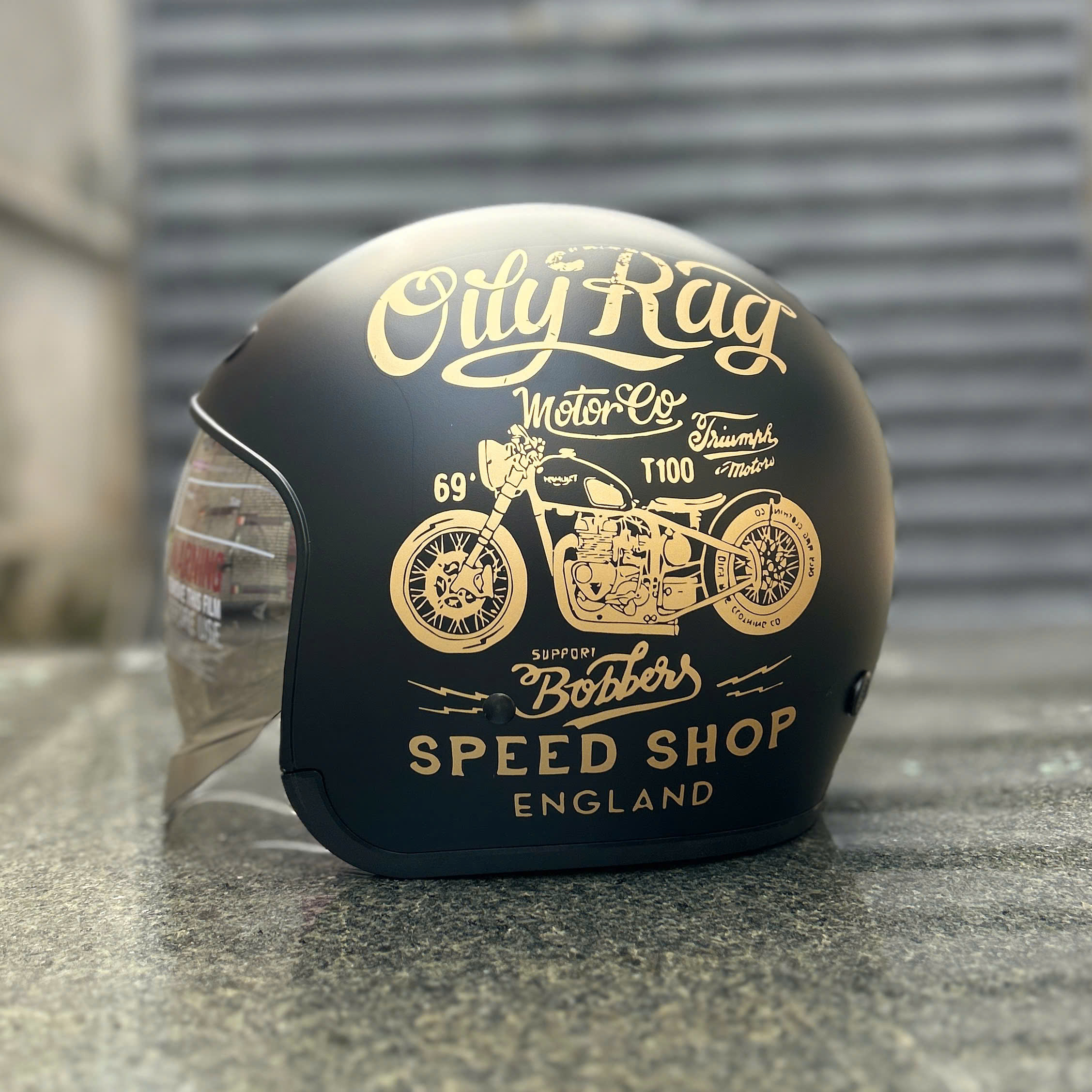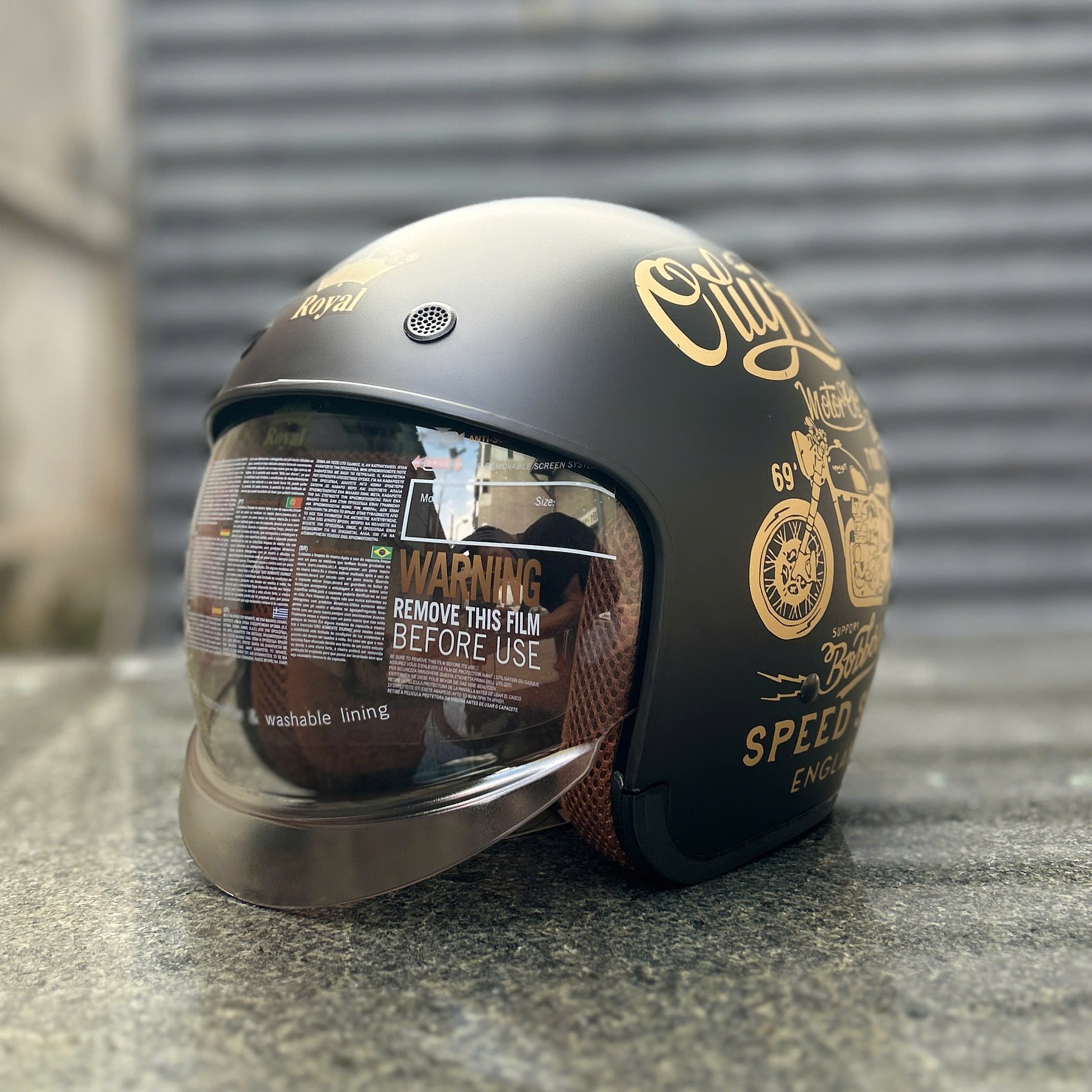 - Phong cách thiết kế: mũ kiểu 3/4 kèm kính dài, mũ được thiết kế dáng tròn, đi kèm 2 miếng ốp má, giúp tăng thêm hiệu quả bao phủ, bảo vệ khuôn mặt. -